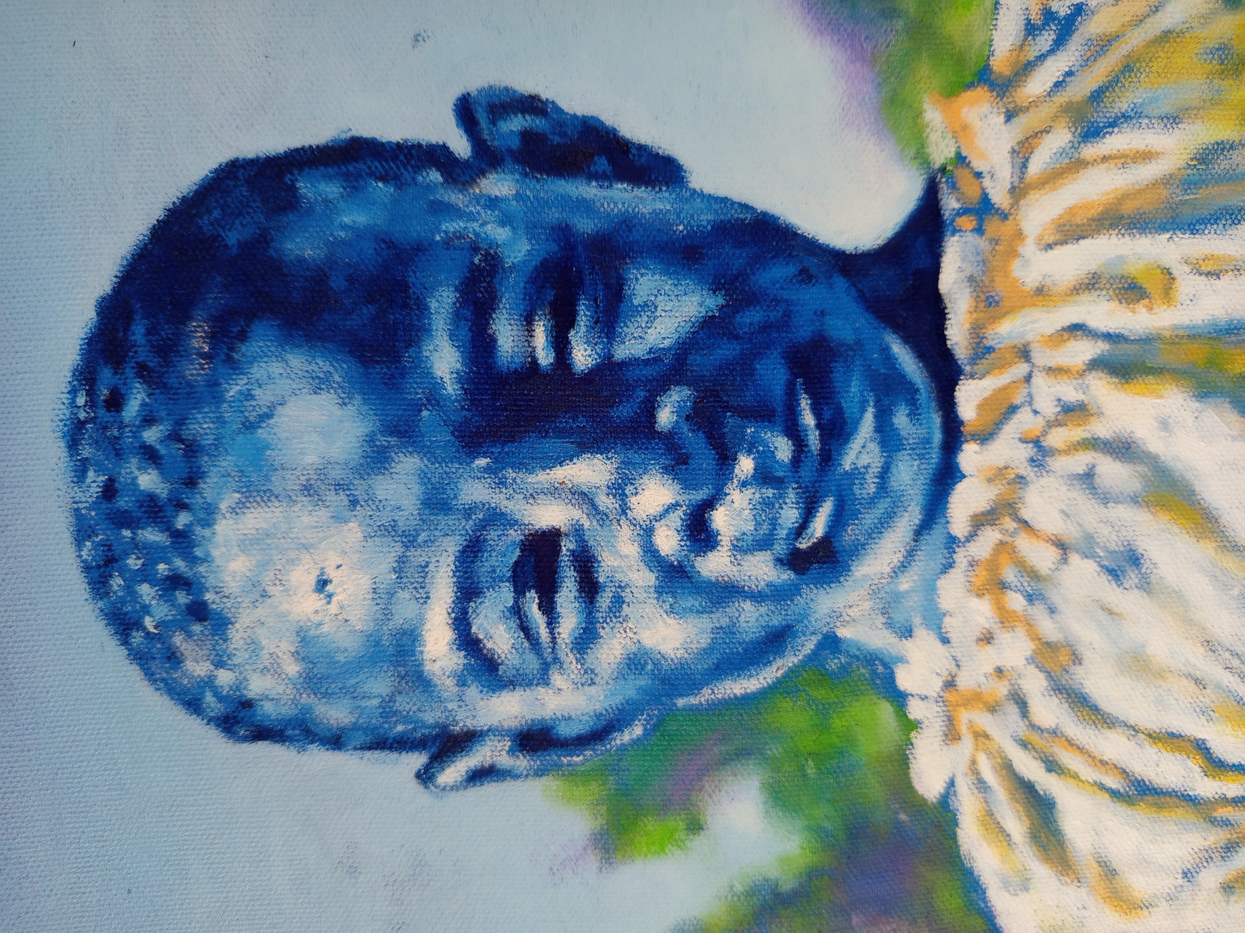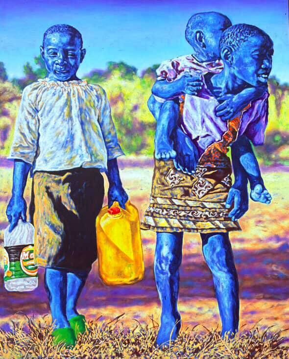 My art is rooted in lived experience and the stories often left untold. I use a vivid palette, with blue as my signature tone, to portray children as symbols of hope, resilience, and possibility. Blue speaks to me as a dual language of struggle and strength; it embodies vulnerability yet radiates dignity. In my work, everyday moments such as carrying water become metaphors of endurance, care, and survival. These children, painted in blue, are not just individuals but universal figures that reflect the challenges faced by many while reminding us of the strength within community. By contrasting their forms with vibrant, textured backgrounds, I seek to highlight presence in the midst of hardship, visibility in spaces of invisibility. My intention is not only to create striking images but to open dialogue, to evoke reflection, and to encourage a deeper awareness of identity, memory, and social justice. This work is part of continuing 'Untold Stories series'.