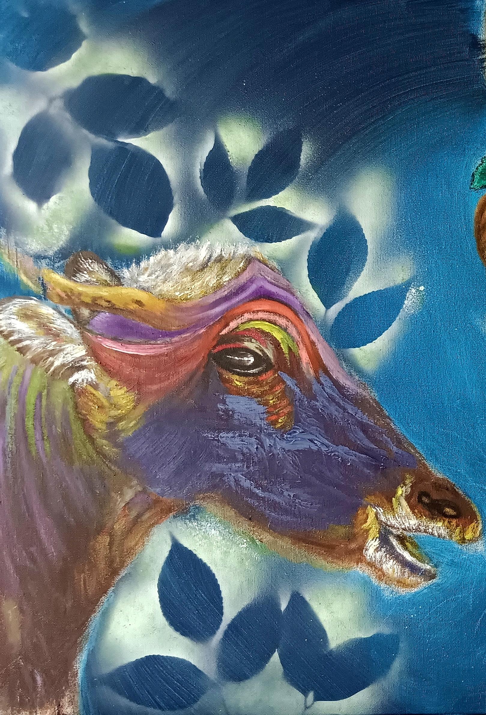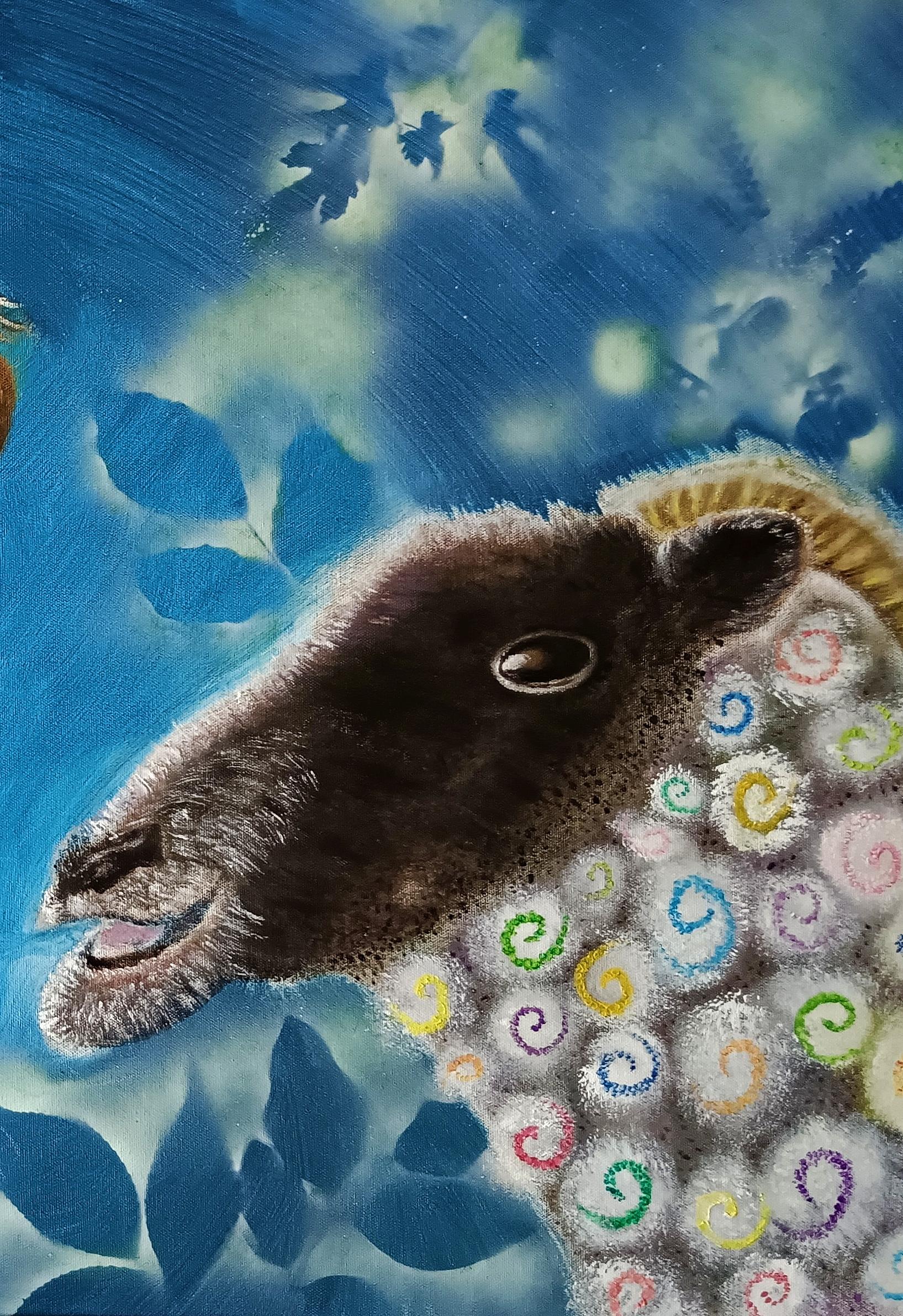 The inspiration came from a my backpacking trip to Killarney, Ireland, where I saw horses, cattle and black-faced sheep grazing freely on the hillsides. The unrestrained and leisurely atmosphere presented a peaceful and tranquil paradise. Therefore, this painting would like to convey the joyful atmosphere of "pleasure alone is not as good as happiness among others". Different species are harmonious and share together, because the happiness shared with each other is better than owing it alone. The long-lasting love of mutual companionship is the most touching.
