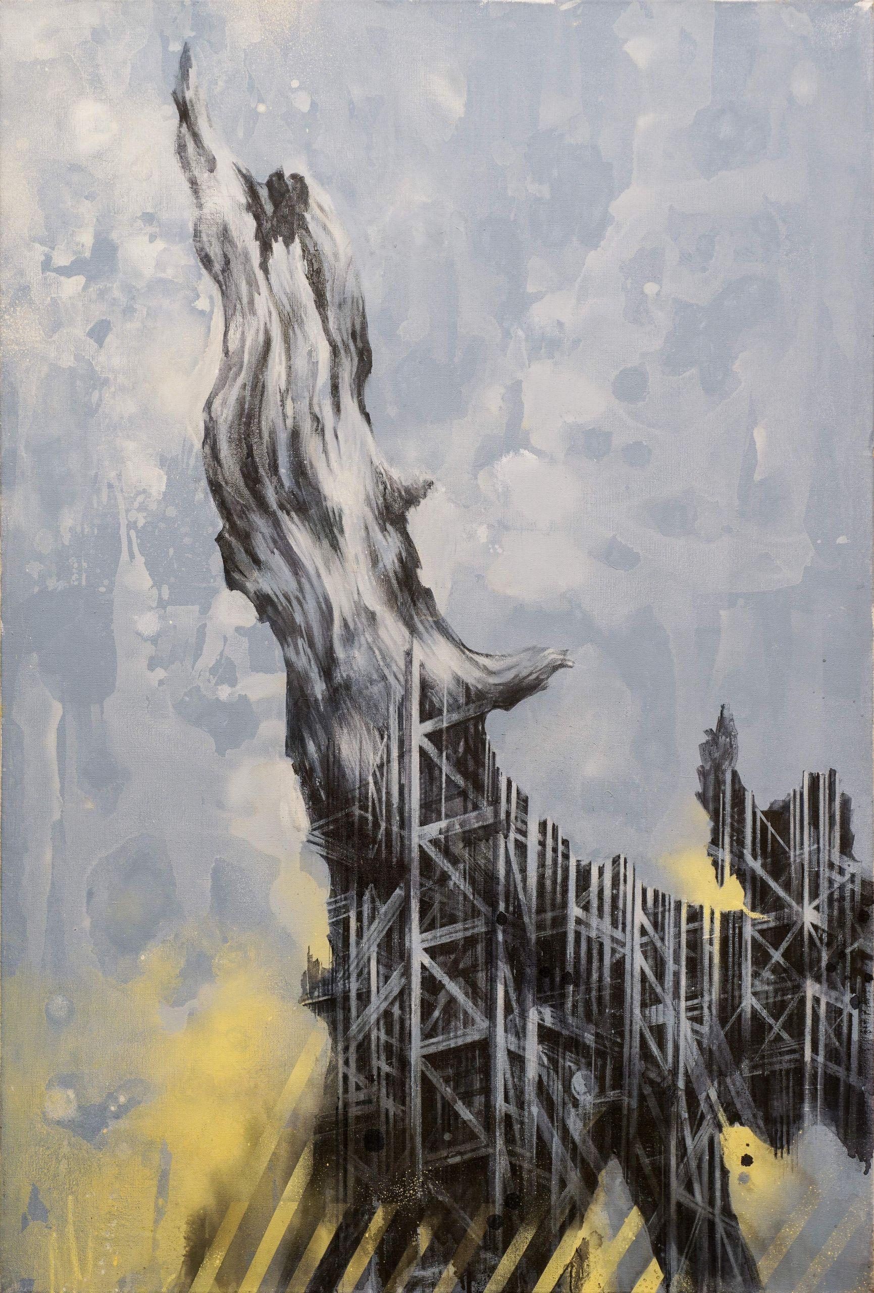 The title of the series "Symbiosis" is intended to adjust the viewer's optics while interacting with the work. Symbiosis refers to all types of relationships between organisms in which at least one organism benefits for itself. This concept illustrates the way two inseparable, yet contrasting environments, such as nature and human, coexist today. The painting depicts a cold dead tree trunk, shrouded in haze. It looks stricken and poisoned. It is illuminated by a faint yellow light that reminds of yellow technical markings in factories. Carefully traced details of factory structures, endless geometry of gloomy slopes occur through the wood. The picture is a metaphor that draws attention to the urgent problem of excessive consumption of resources and unauthorised deforestation, in particular.