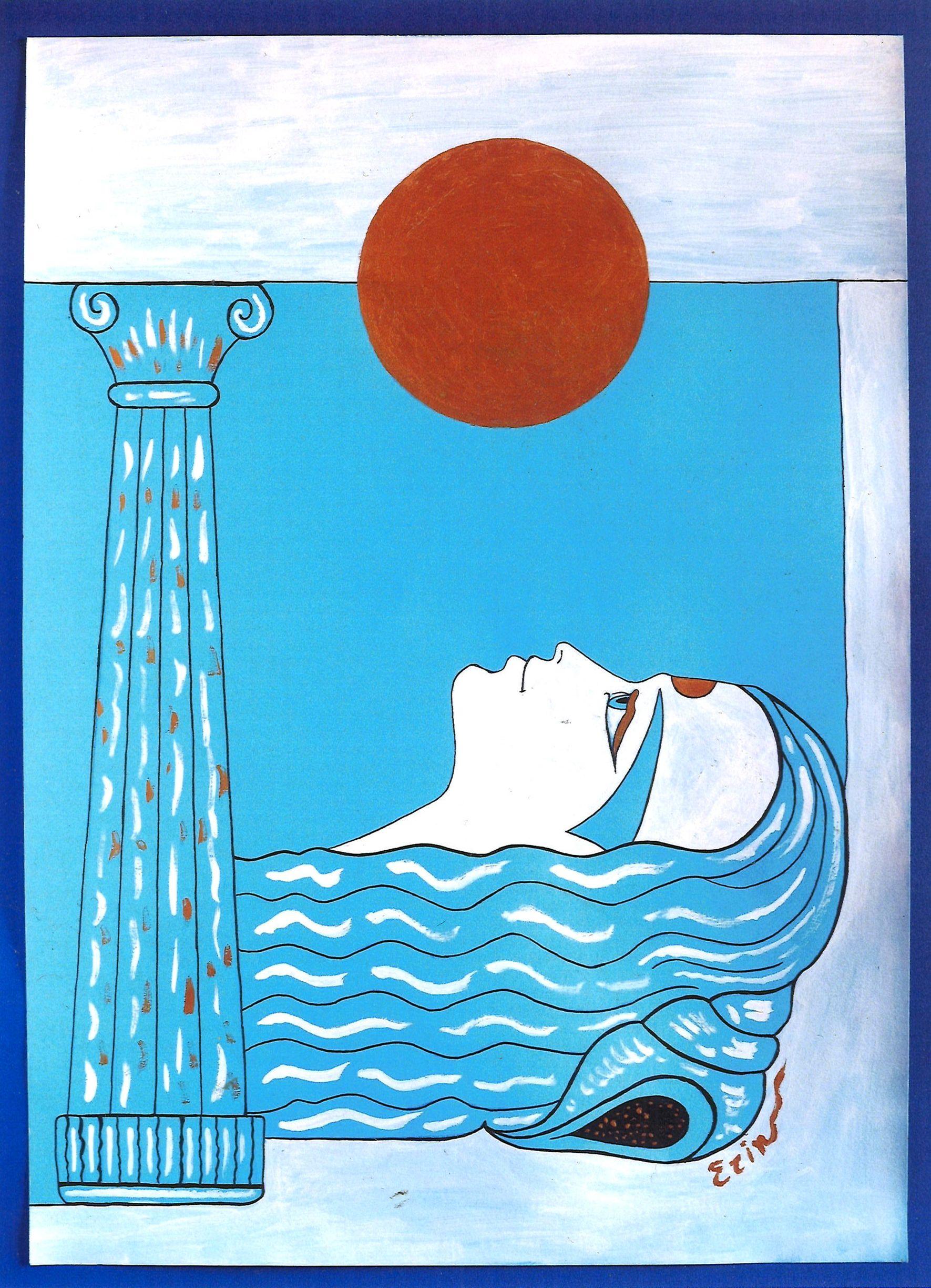 The sea has the profile of a woman's face, the hair forms waves and helds a shell. The sea and the woman are similar because life originates in their womb.