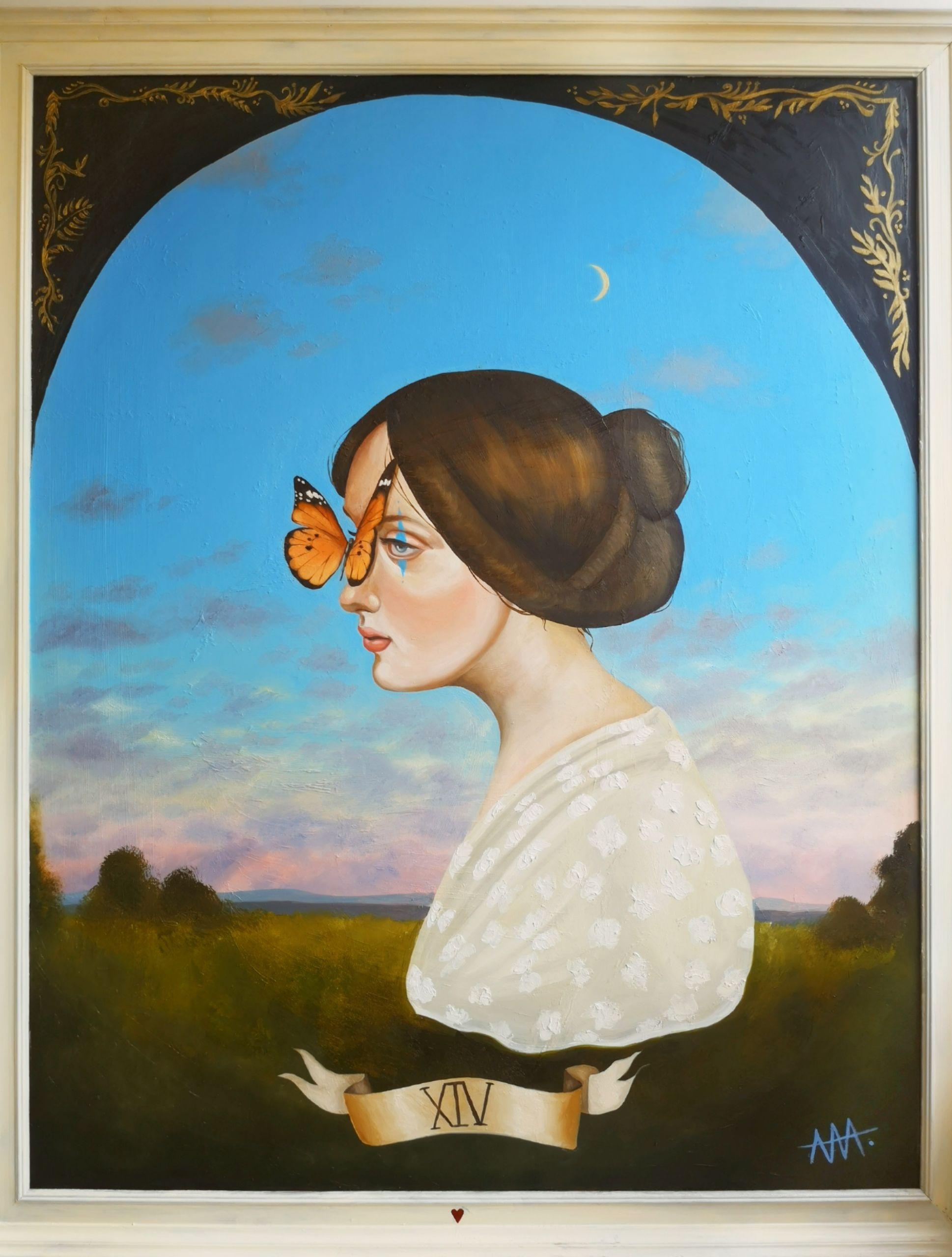 "Temperance" was made during spanis confinement in April 2020. We've had expirienced many death and loss, and we where already in two months of lock down, and there was another one to come. One year ago I made a painting called "death", inspired in number 13 and it´s symbology, representid death as a beautiful woman with butterfly wings. That painting for tecnical difficulties was severely damaged, and almost totally destroyed.