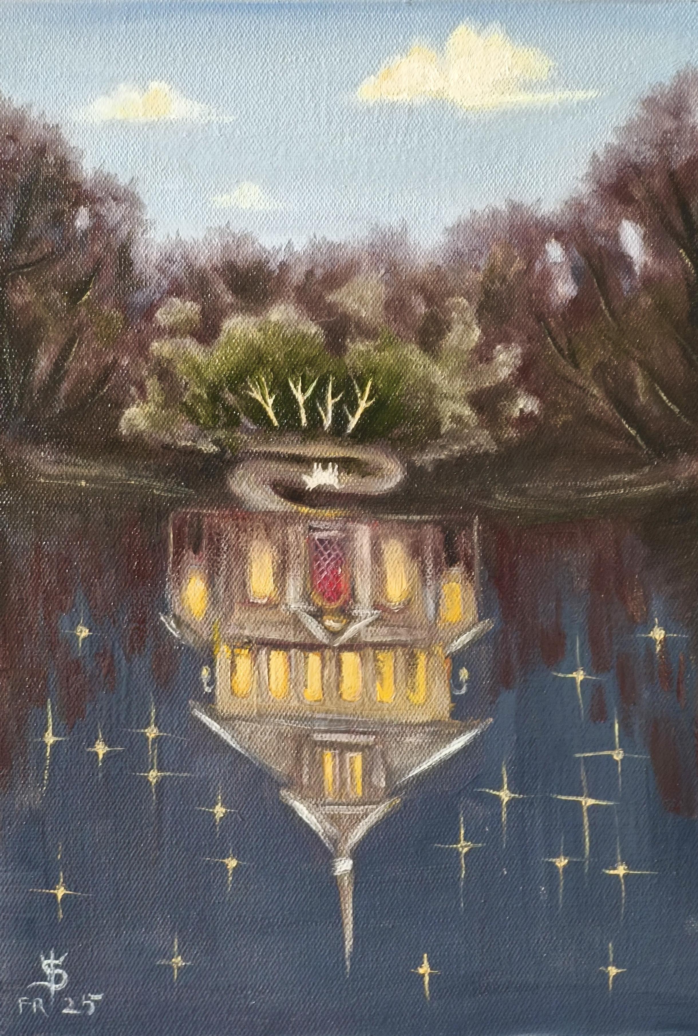 The house itself is not painted directly but revealed as a spectral reflection in a nocturnal pond. Above it unfolds the daylight sky of France, my place of exile, while below the inverted image glows like a cathedral of memory. At the center stands a small white inverted dog, a fragile guardian between worlds. Surrounding it are nineteen radiant stars: the number of the wanderer in Kabbalah, the mark of 2019, and the precise year when exile began (Russia).