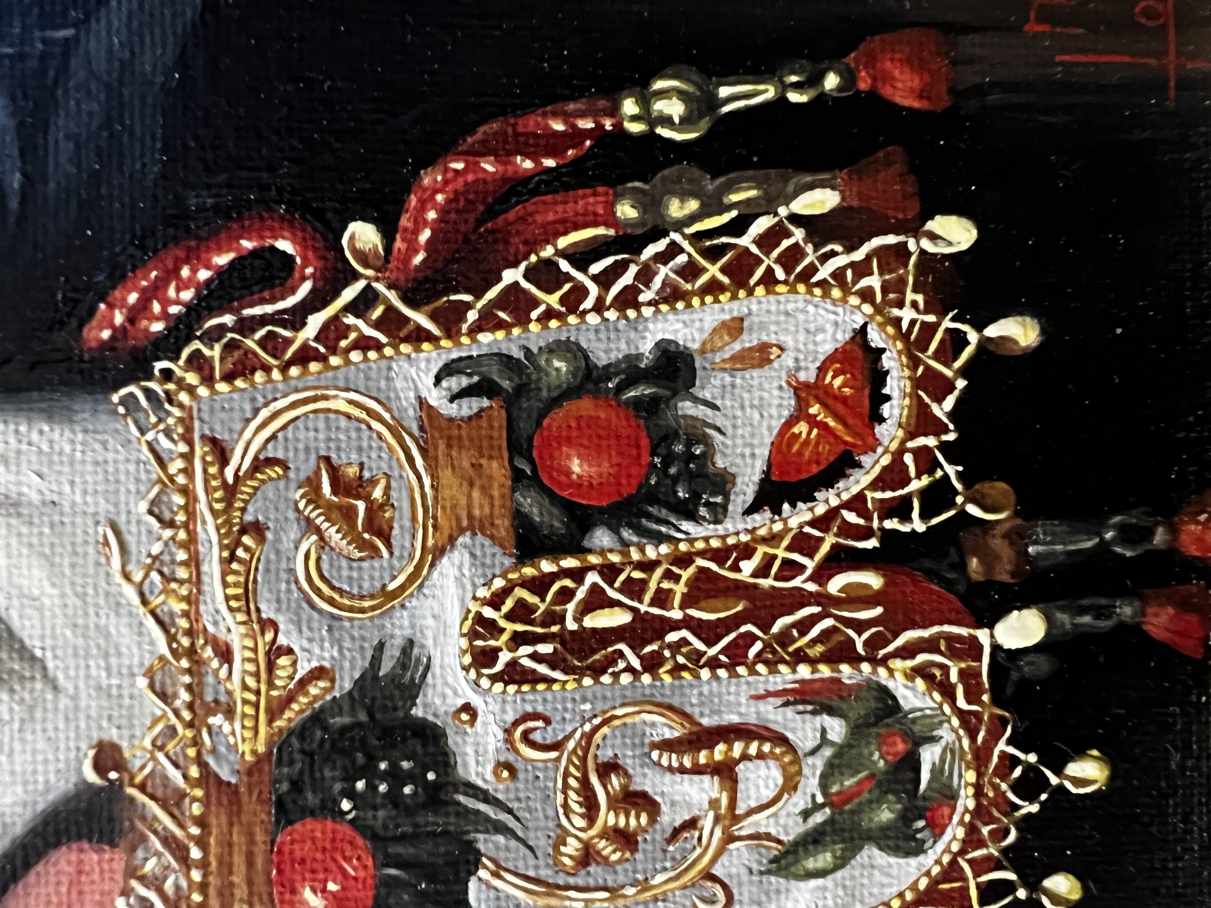 The gloves, richly decorated, evoke a world of elegance, status, and ritual. The artist has worked with precision on the ornamental details, from the golden patterns to the small red embellishments, down to the threads and fringes that fall naturally. They are not mere accessories, but objects charged with identity.