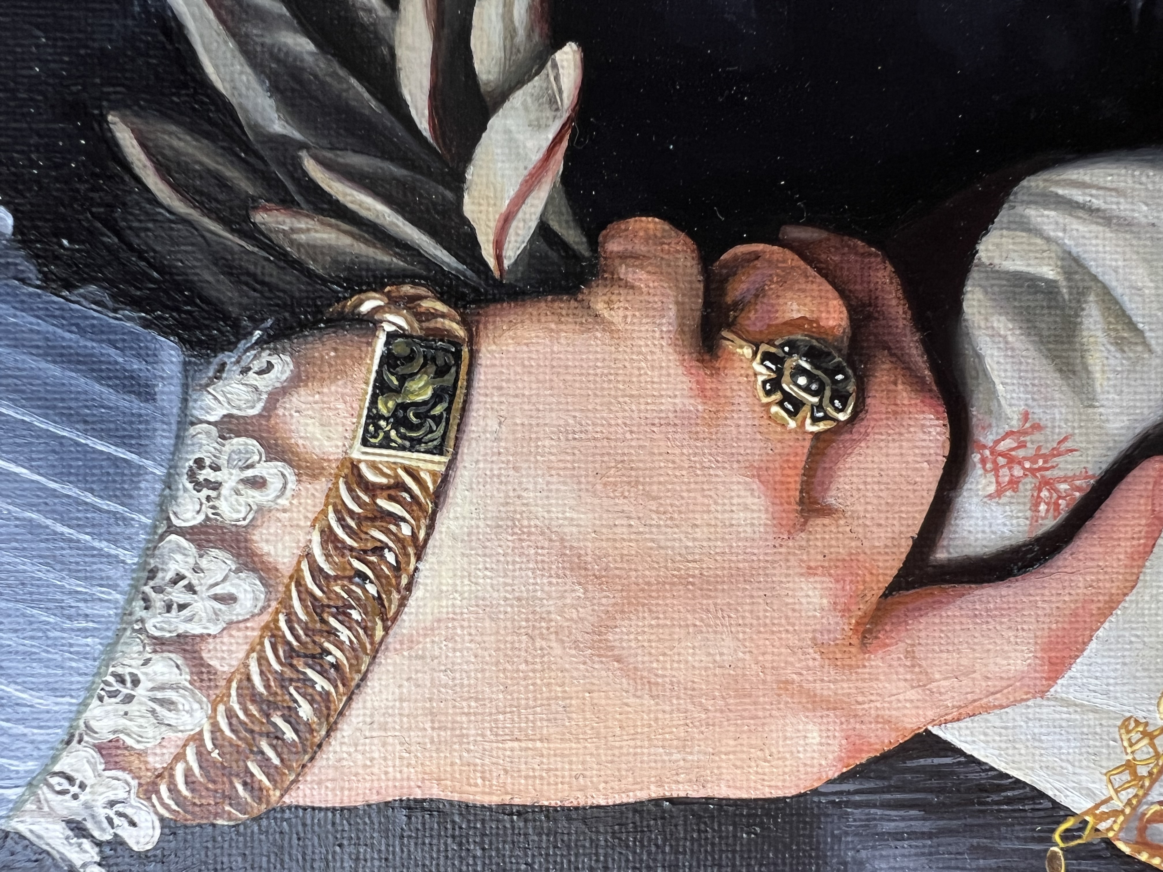 There is a strong contrast between the softness of the skin, the controlled rigidity of the gesture, and the almost excessive richness of the gloves. The artist has created a balance between restraint and opulence, between the living body and the crafted object.