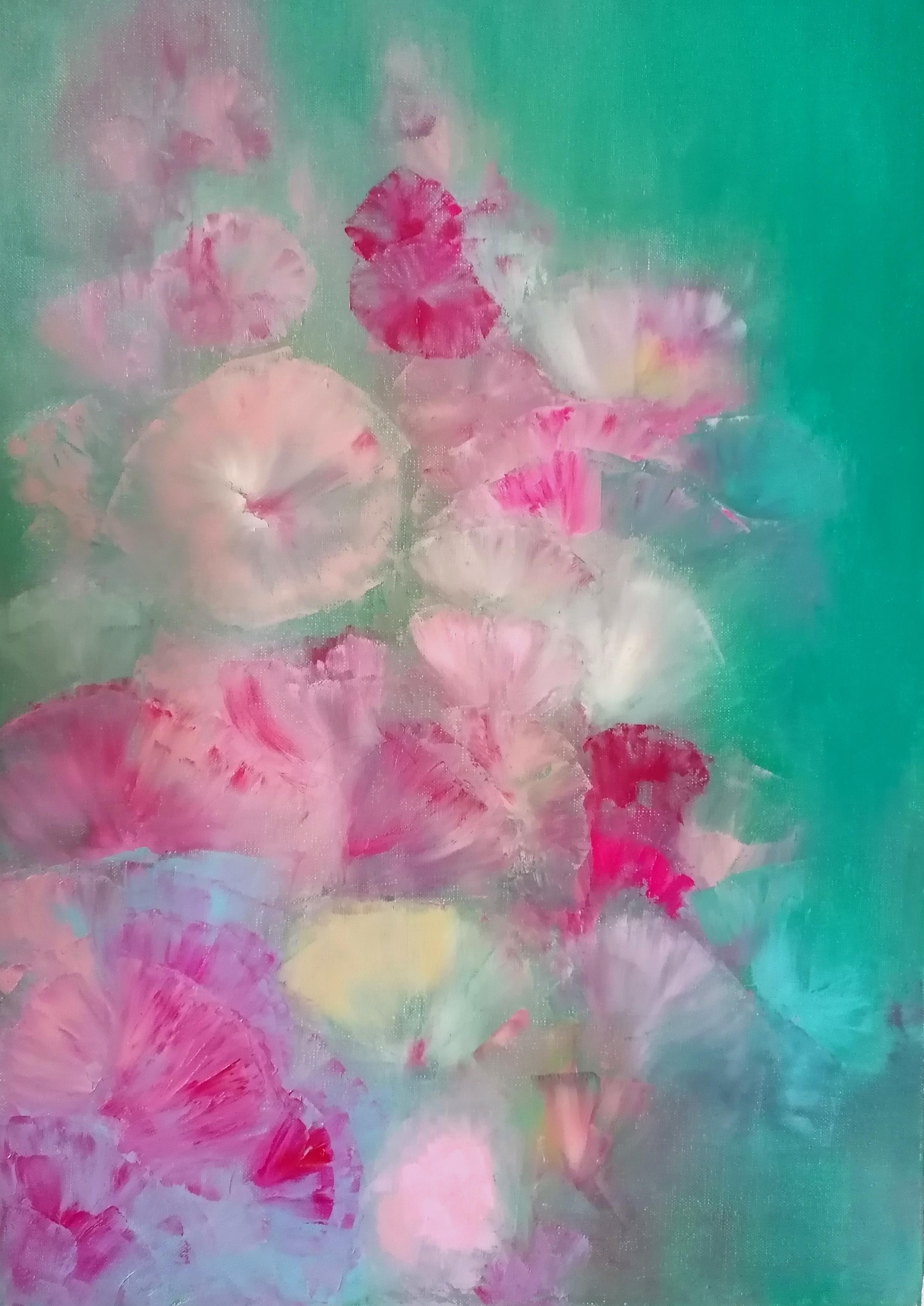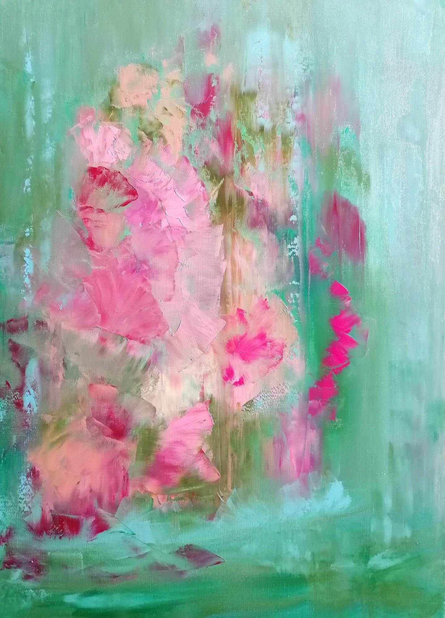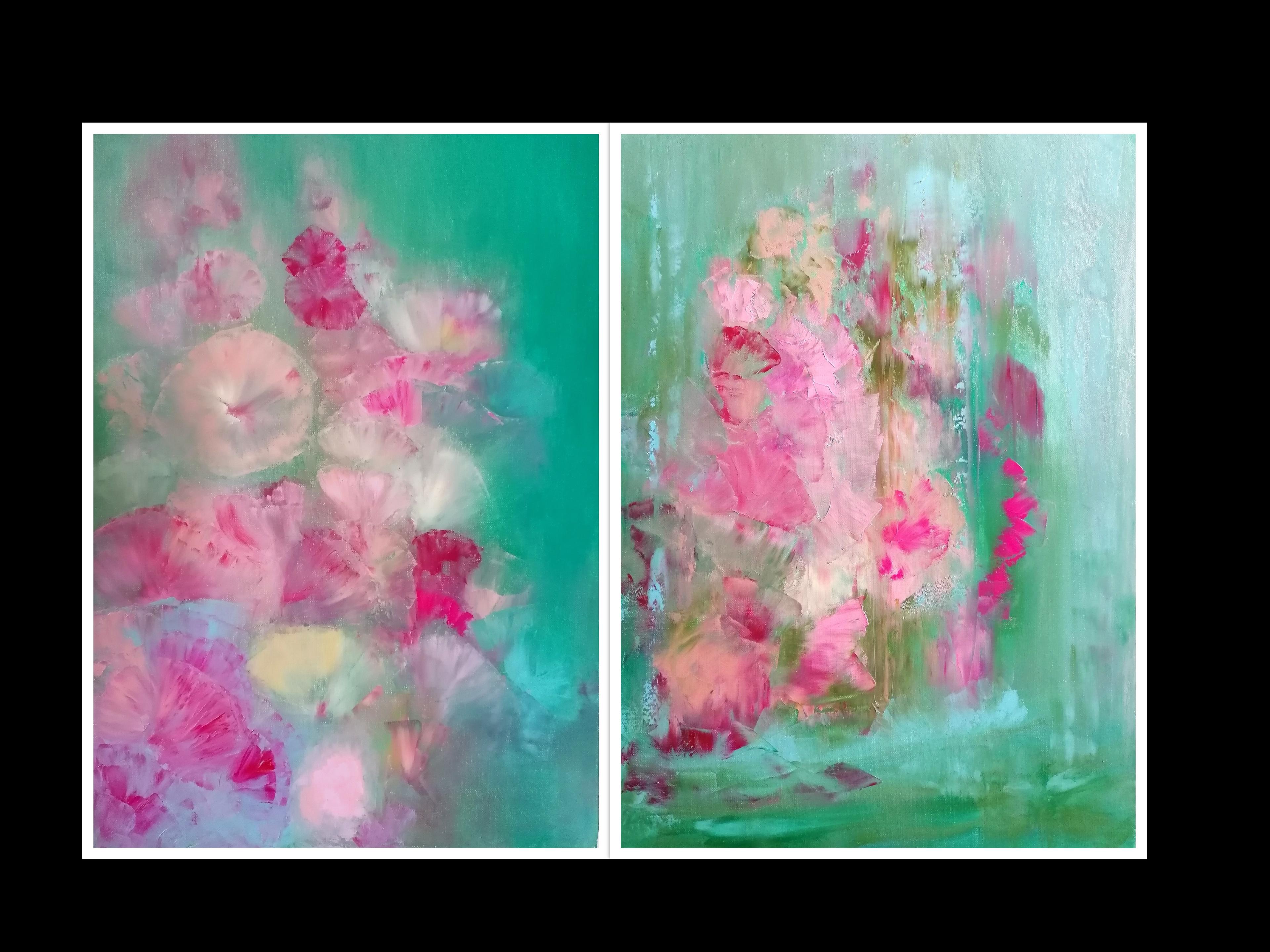 The Hollyhocks symbolize tenderness, care and close relationships. In first painting titled "The Tenderness of The Hollyhocks" I wanted to find a subtle form for expressiveness of tender. That's why flowers are like a silk and wrapped in warm, all-encompassing greenery. The second part titled "The Hollyhocks in The Pouring Rain" is about primary oppositions. It is enough for a heavy rain to fall, and the hollyhocks face danger, although water is necessary for them to live...This is one of paradoxes of nature. Safe is combined with danger; care with neglect; tenderness with coldness; love with hate; acceptance with rejection; health with illness; life with death, etc. You may see hollyhocks as human in danger from pouring rain, but human can be also as a pouring rain destroying flowers and other parts of nature. This painting was stationary exhibited at LuminNoir Art Gallery in London (22-31.VII.2025). Each painting size is 50x70cm.