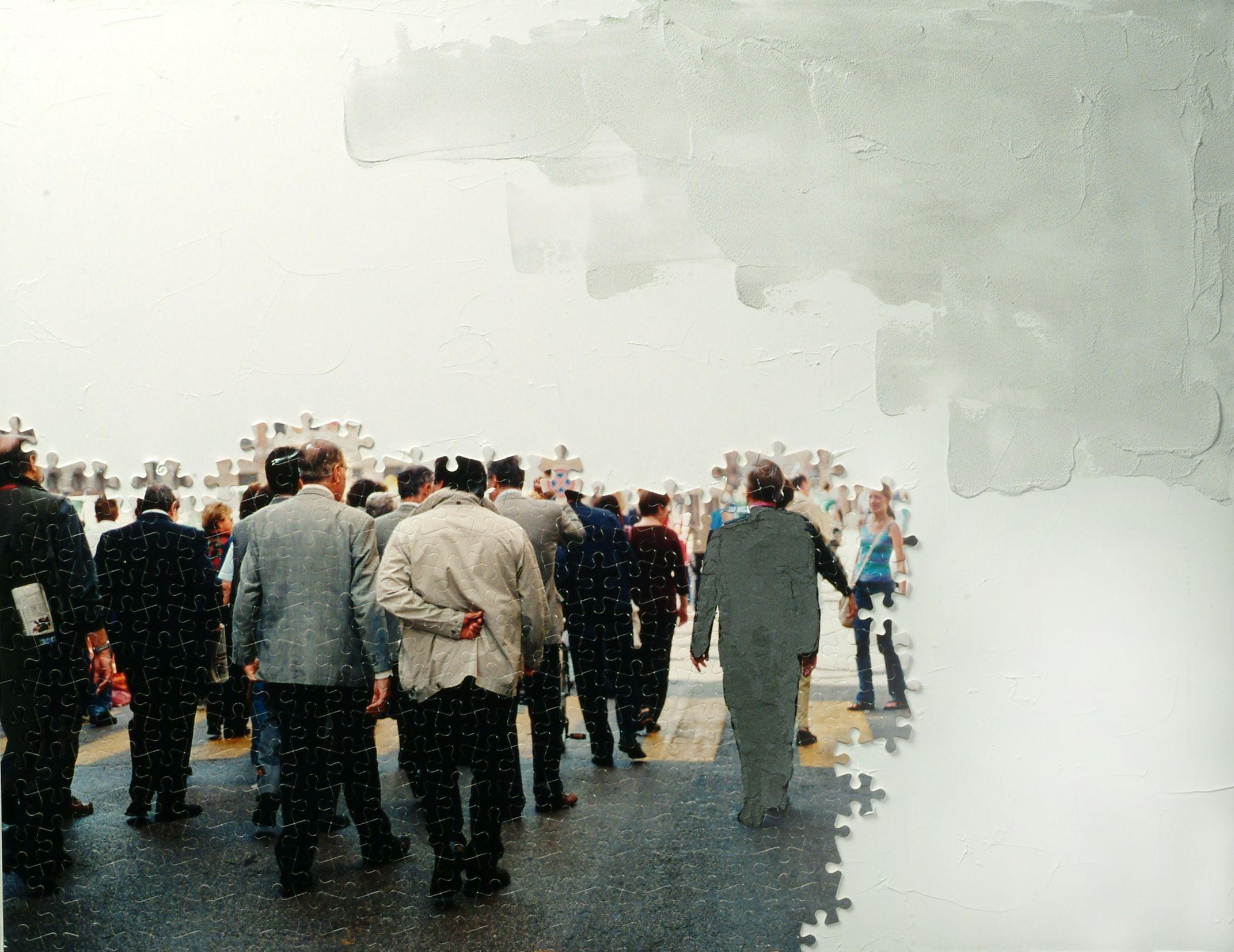 In the PUZZLES group of works, images of everyday reality are broken down and decomposed into nothingness. A playful aspect of life emerges in the technique, but also the tragic of an era that is seeing its decline. Men walking towards emptiness, cars merging with a nature that absorbs them, mechanical means superimposed in a technological chaos.