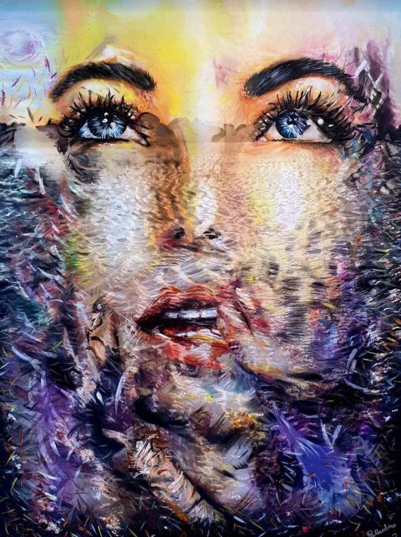 Questo dipinto rappresenta l'Umanità, ma per mia scelta è raffigurata dal volto femminile. Nelle mie tematiche tratto anche e soprattutto la scissione tra il bene e il maschio, le diversità caratteriali nella coppia attuale, ma c'è sempre un'originaria e volontà positiva di energia che esplode e fa andare oltre gli ostacoli.