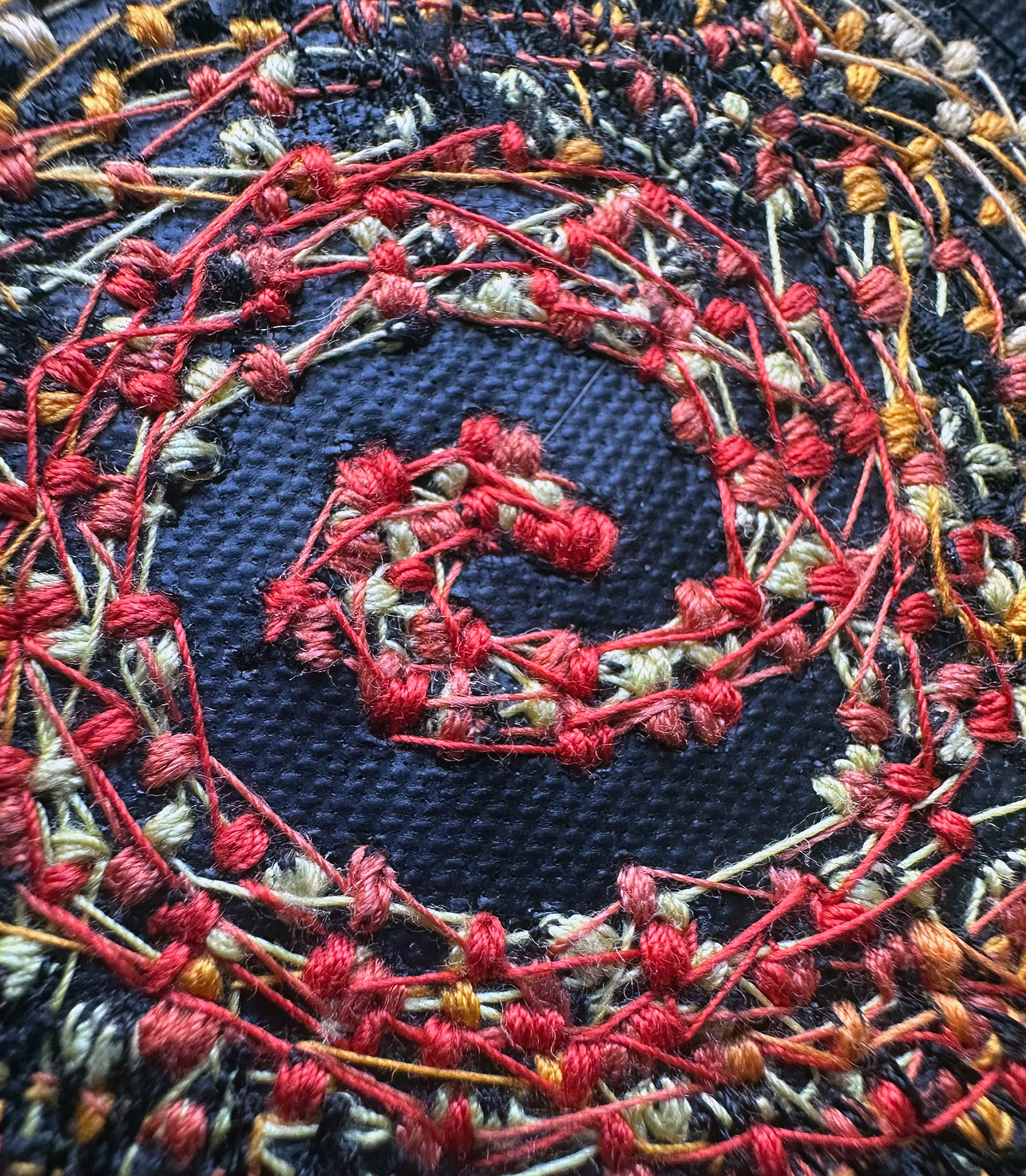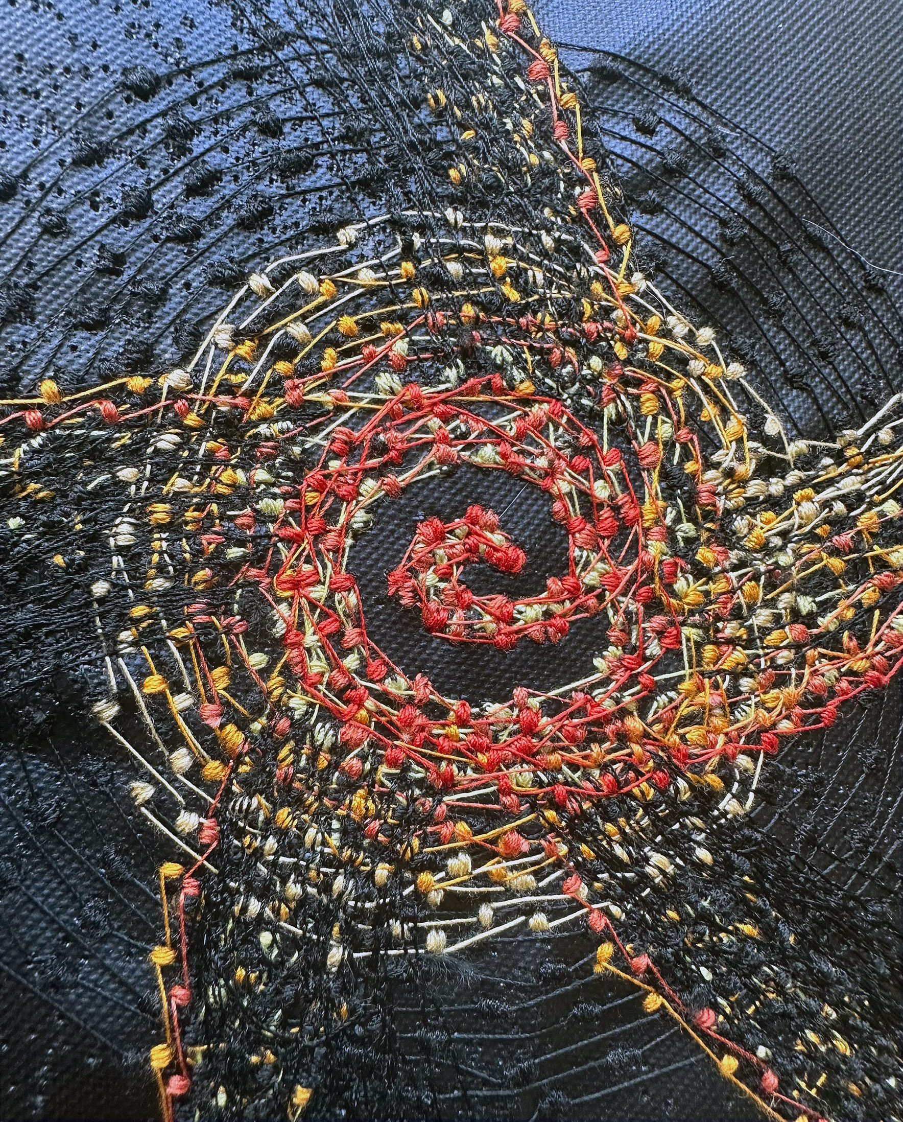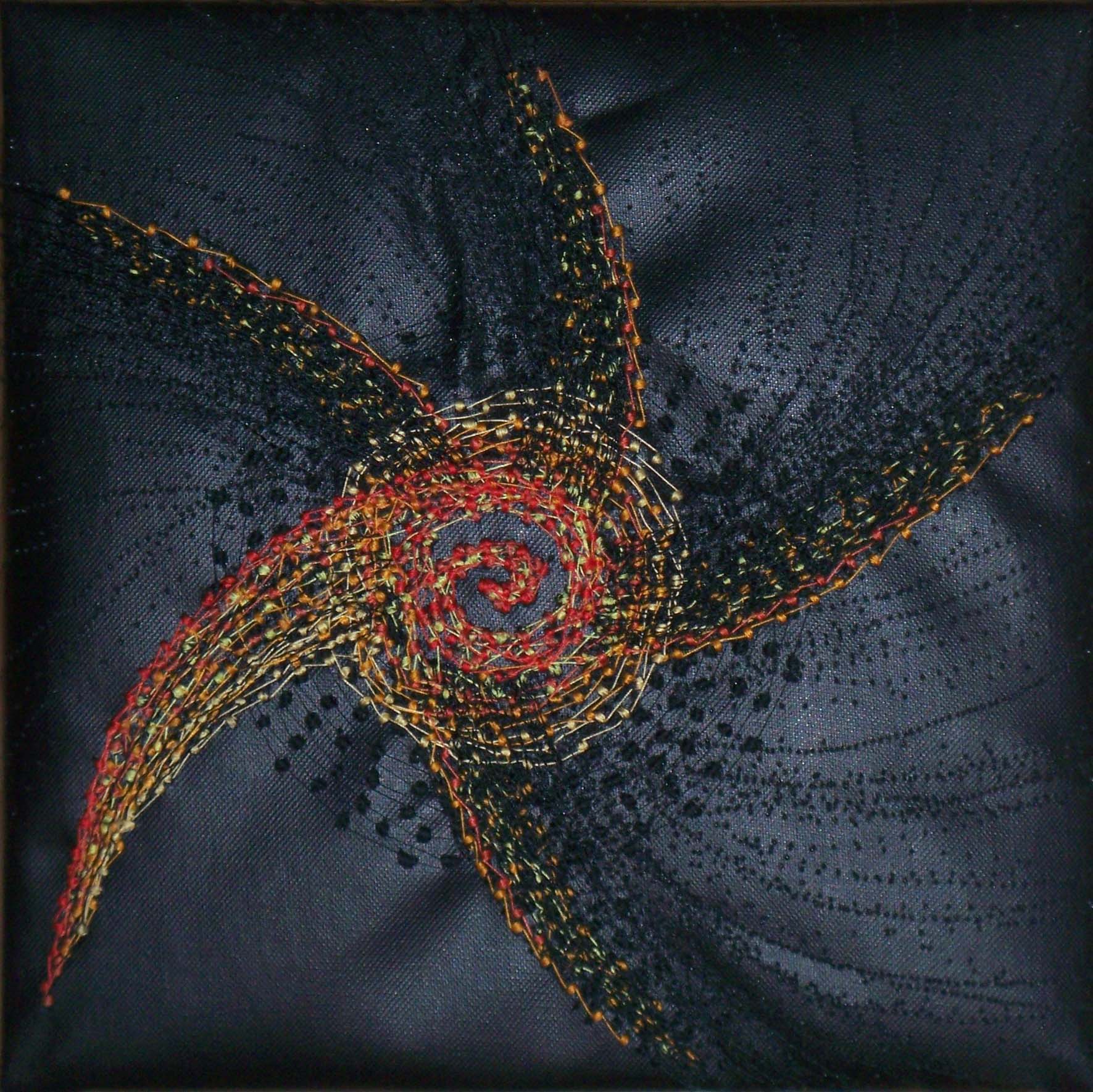 In this experiment I expanded the contrast between the black fabric and the yellow and red yarn I used for decoration. Whereas the motiv is spinning around like a rotating sun the ground is filled with black stitches and small holes supporting the colourful elements. A small filling brings out the textile character of the artwork.