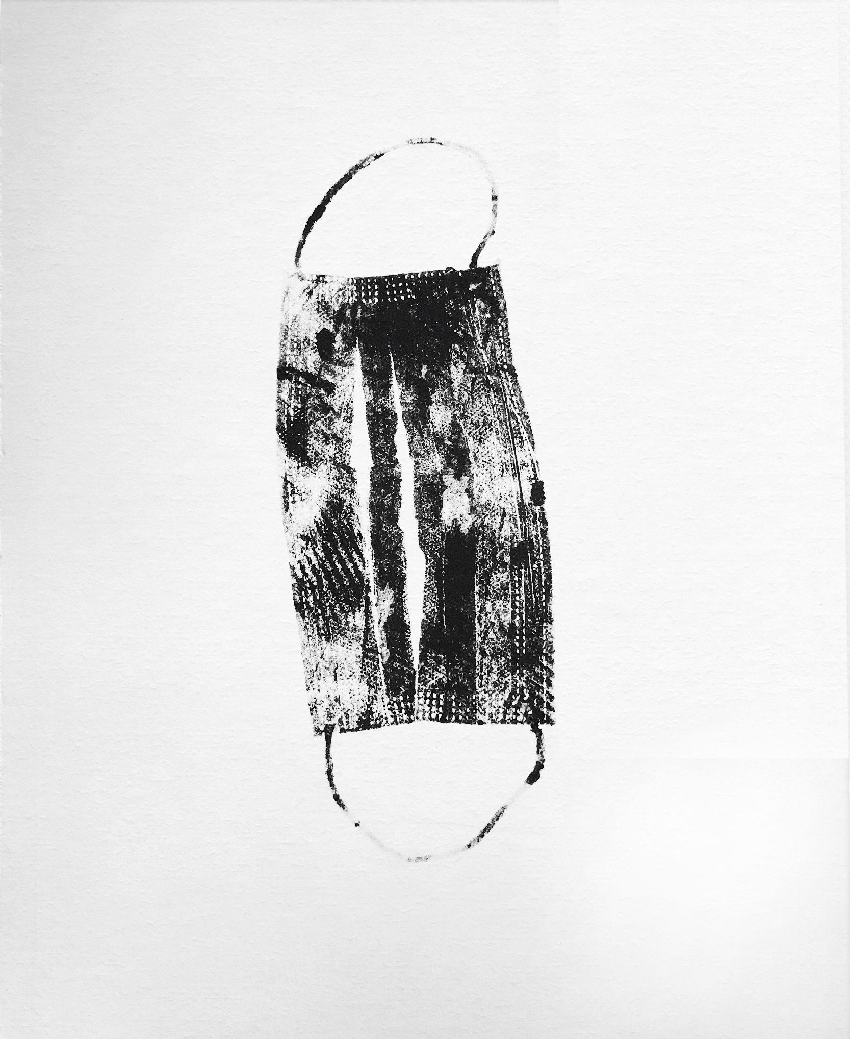 Technique. Prints of used masks and gloves (monotype, object print), collage of these objects. Creative disinfection and recycling of masks and gloves.
