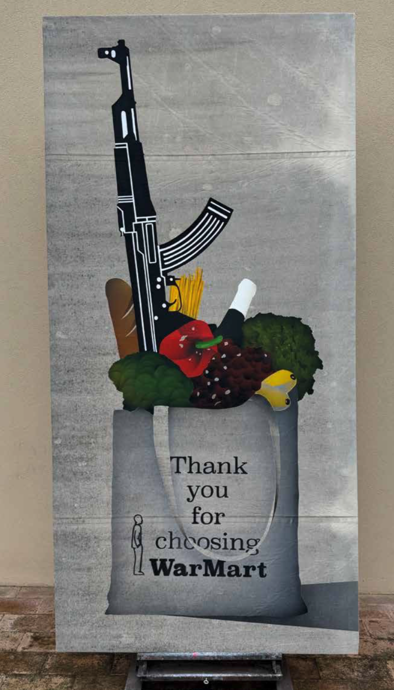 La scritta "Thank You for choosing WarMart" è un amaro commento sull’assurda accessibilità delle armi, ormai vendute con la stessa semplicità di un prodotto da supermercato. L’opera invita a riflettere sulla crescente banalizzazione della violenza e sul nostro ruolo nel sostenere un mercato che trasforma la guerra in un bene di consumo.