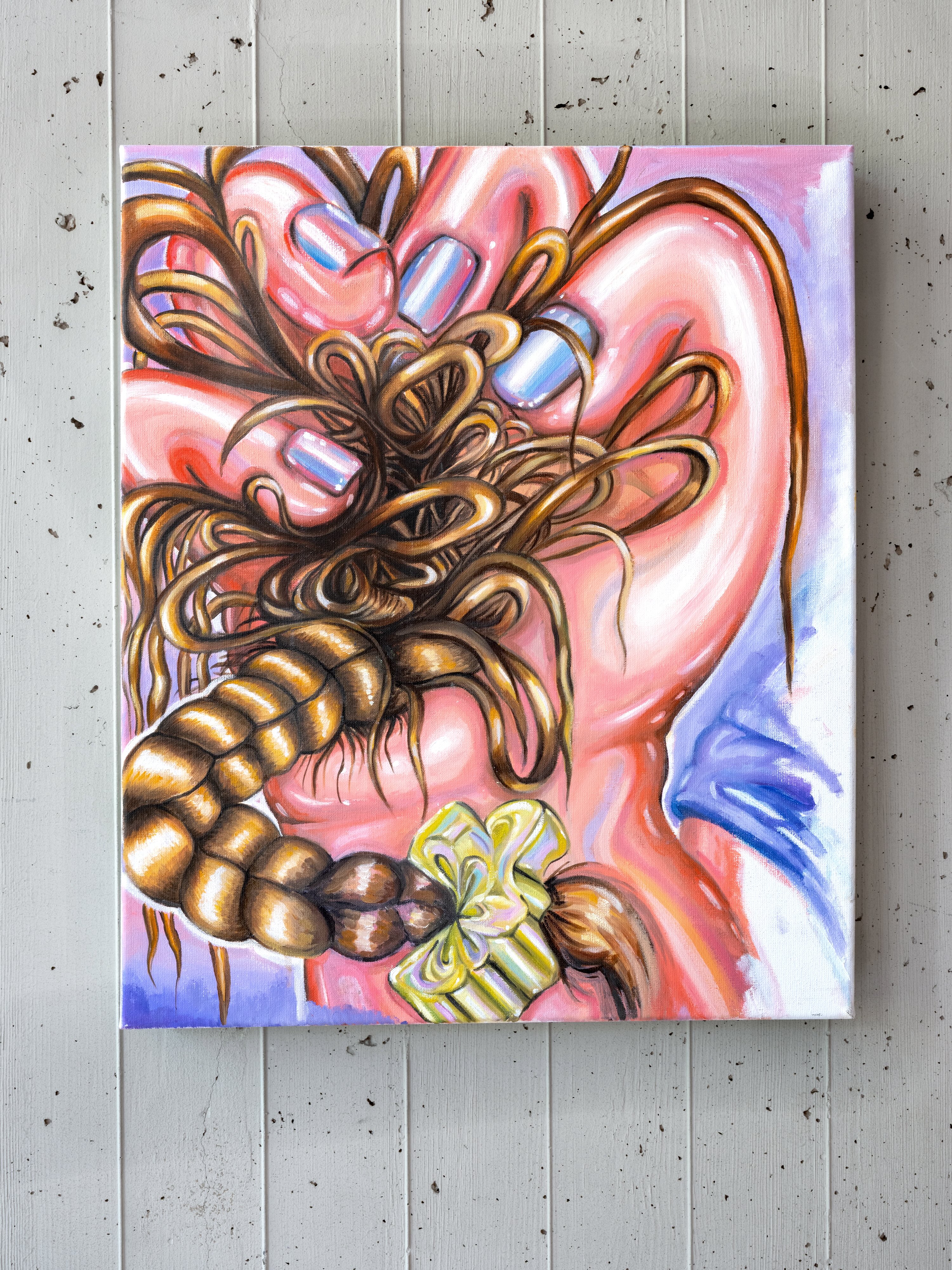 Competition between women, shaped by patriarchal structures that create an environment of scarcity—whether in status, opportunities, or recognition. The hand gripping a severed braid becomes a metaphor for this struggle. Traditionally, a braid symbolizes femininity, connection, and care, yet here, it is transformed into a symbol of rivalry and conquest.