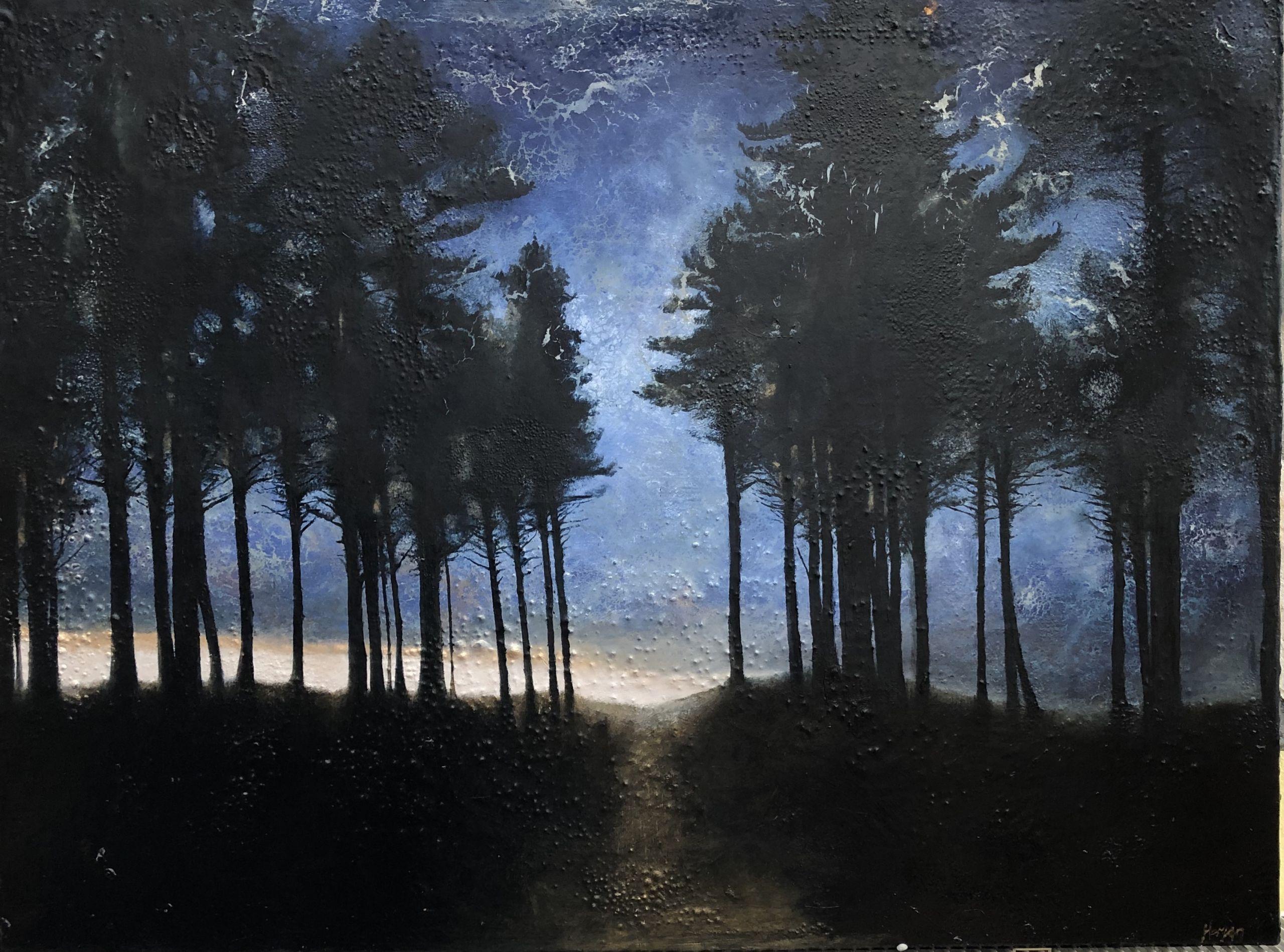 Oil on canvas set on fire. I set my work on fire 3 or 4 times until I have the desired background and then paint into it with Oil paint