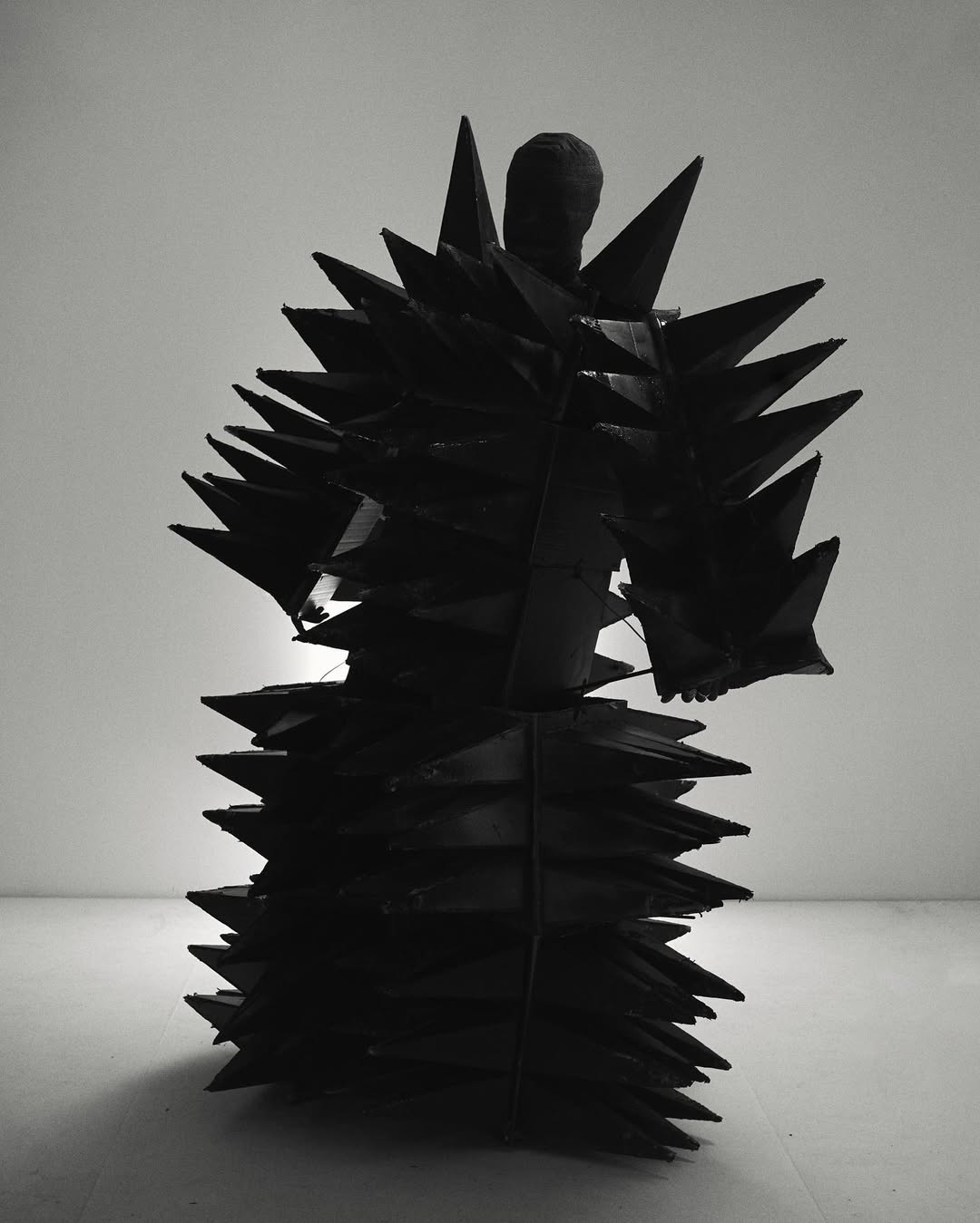 My first wearable sculpture, known as the 'Iron Soldier,' was created for my second live art performance of the year. It was inspired by the iron maiden, a historical torture device, with outward-facing spikes representing the feelings of human loneliness and depression.
