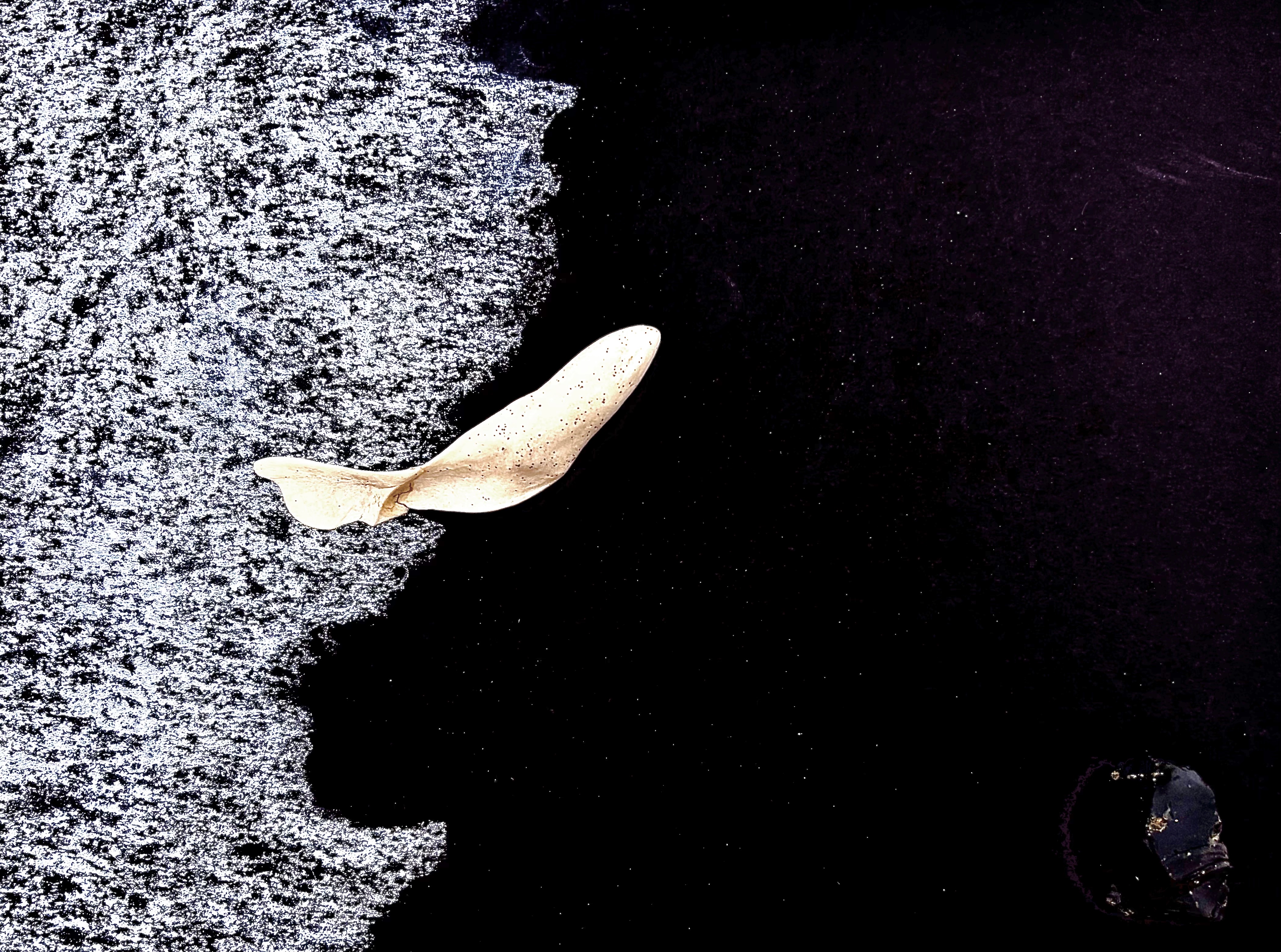 A smelly fishbone, salted pepper on seaside foam, highly decorated by a an onyx skull on lava sand.