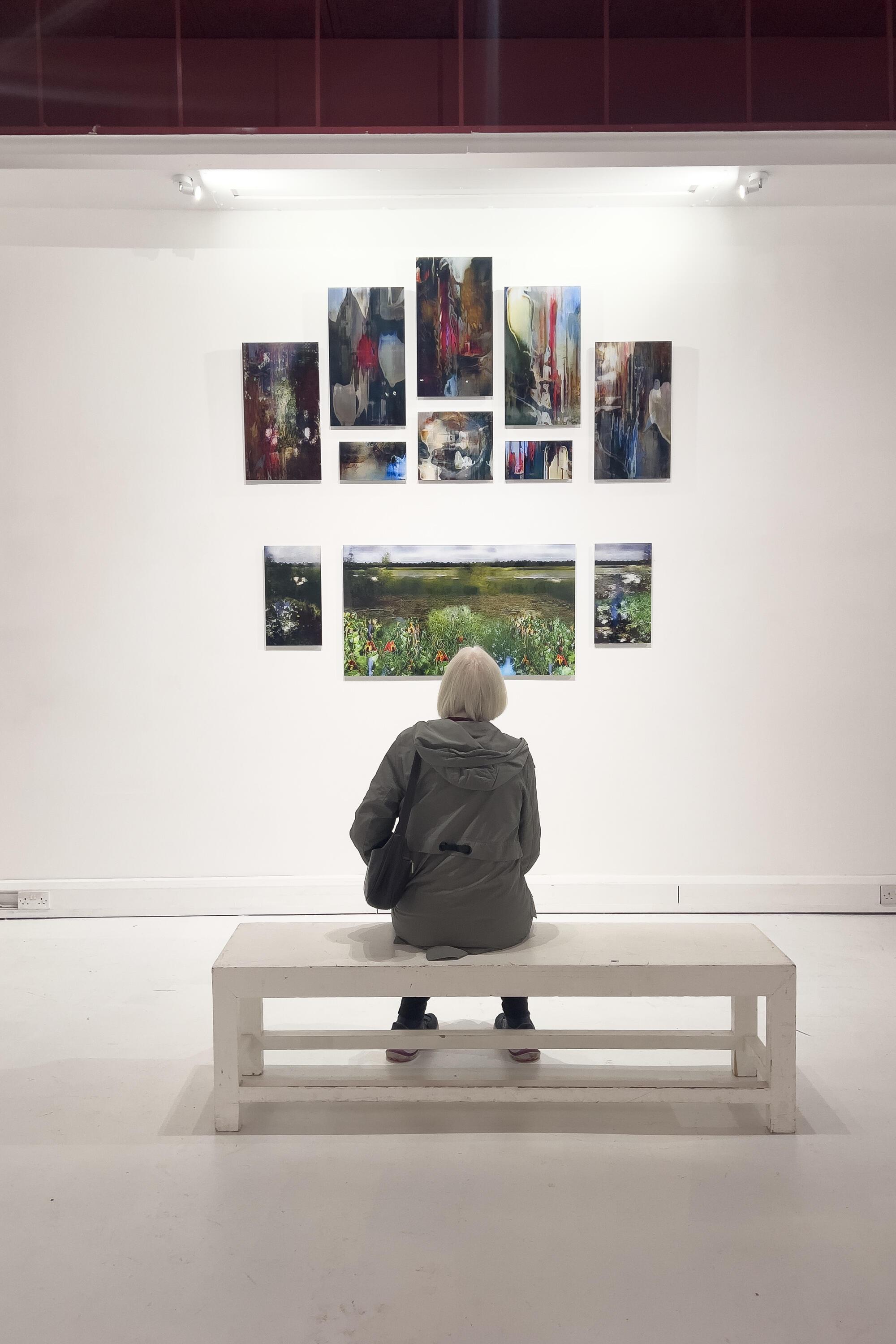 At the Particle Memory exhibition in London, the reflections come to the work. They depend on how many people look at the piece and how they engage with it. However the red colour of the gallery works with the colouring in the work.