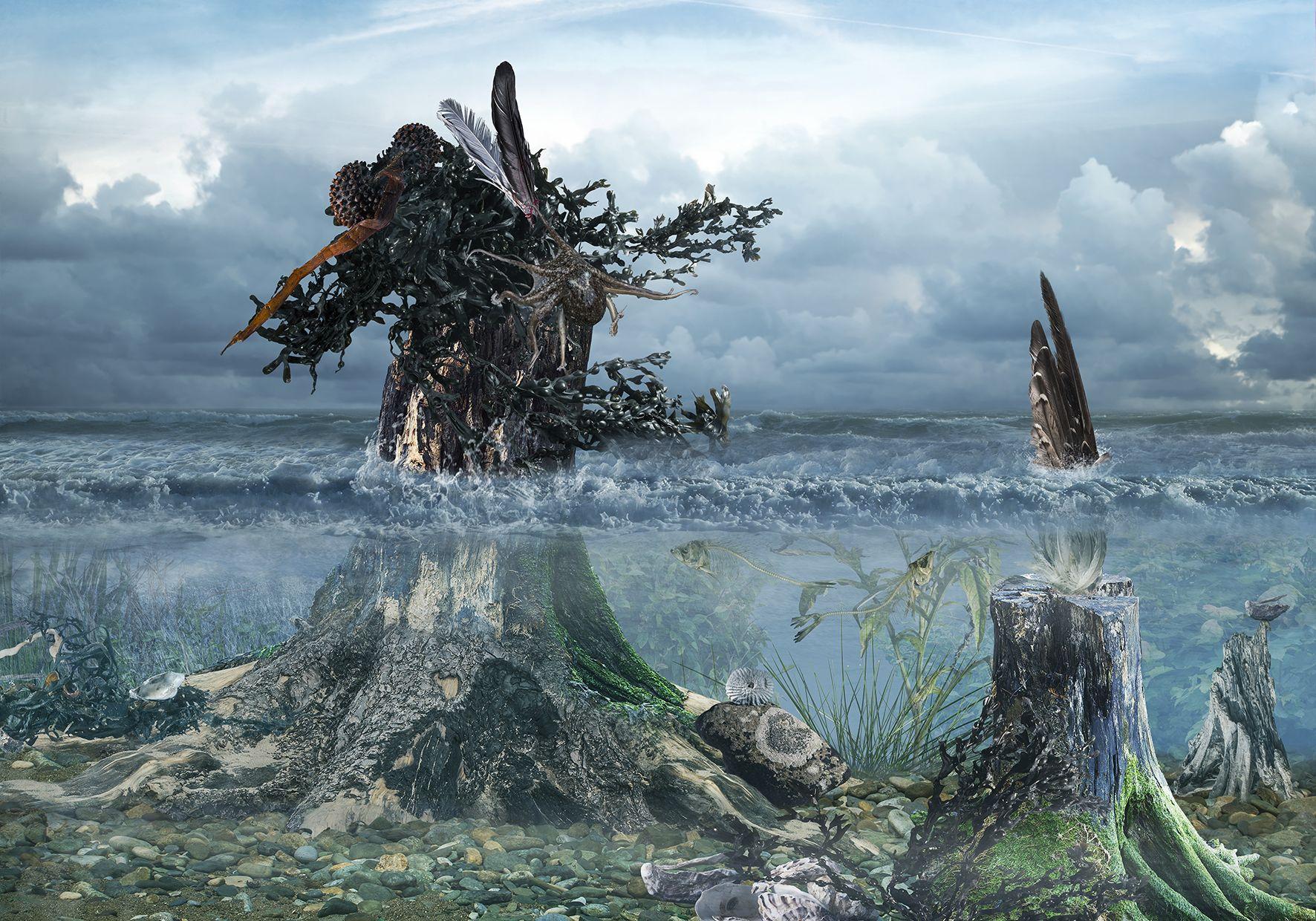 Water divides the image, creating two separate worlds, one above, one below, each with their own message to the viewer. The images question our lack of connection to the natural world and how this is impacting our environment. We are dependent on Nature for our survival, yet we actively damage the earth without consideration for the consequences.Our lack of connection is not only harming us but has contributed to the loss of many species of animals, birds and insects.