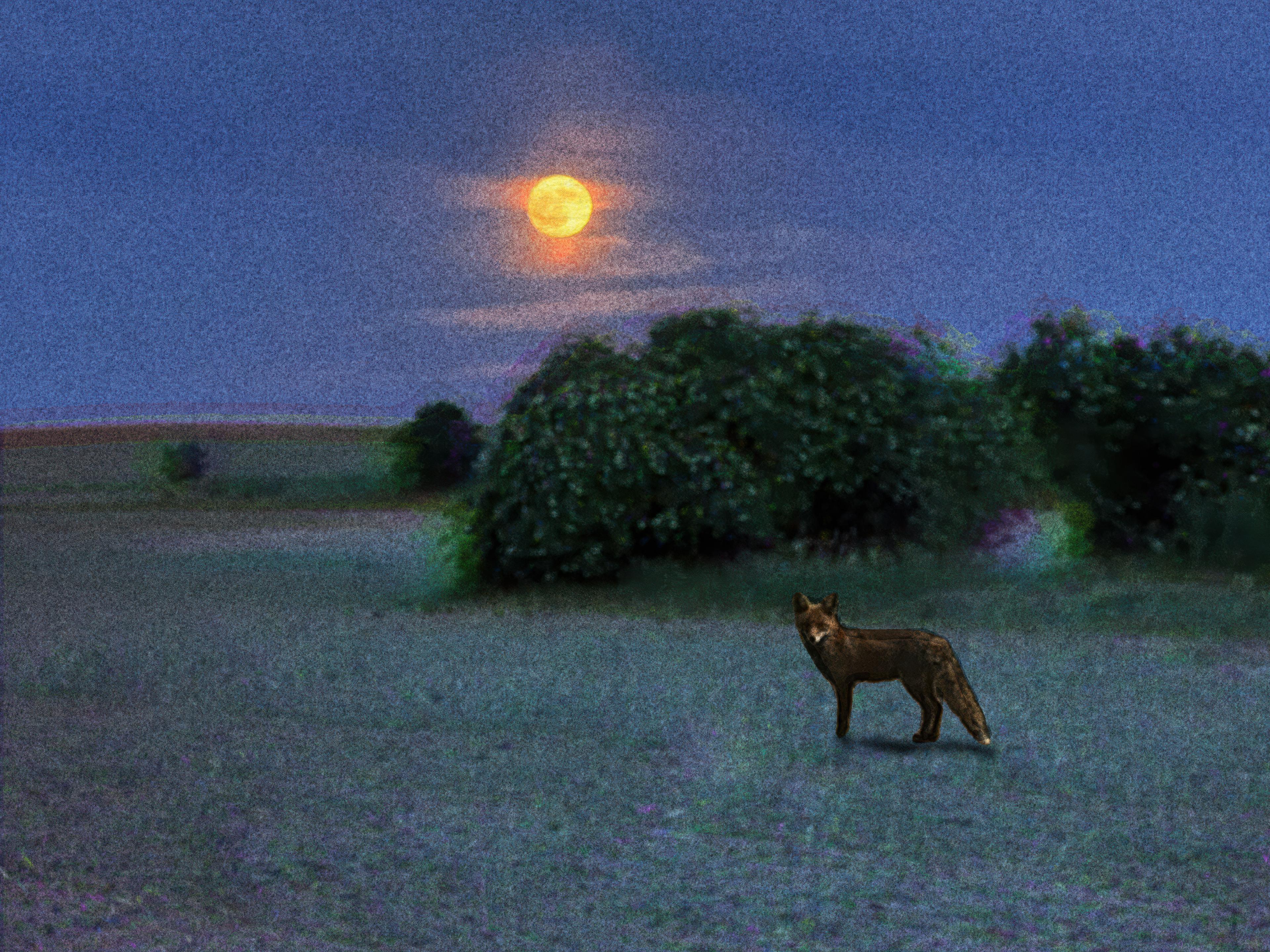 A fox stands alone in a field under the glow of a full moon. The horizon is lined with dense bushes, the sky tinted with the soft blue of night. The animal is alert, motionless, present. The scene feels suspended – quiet, watchful, slightly unreal.