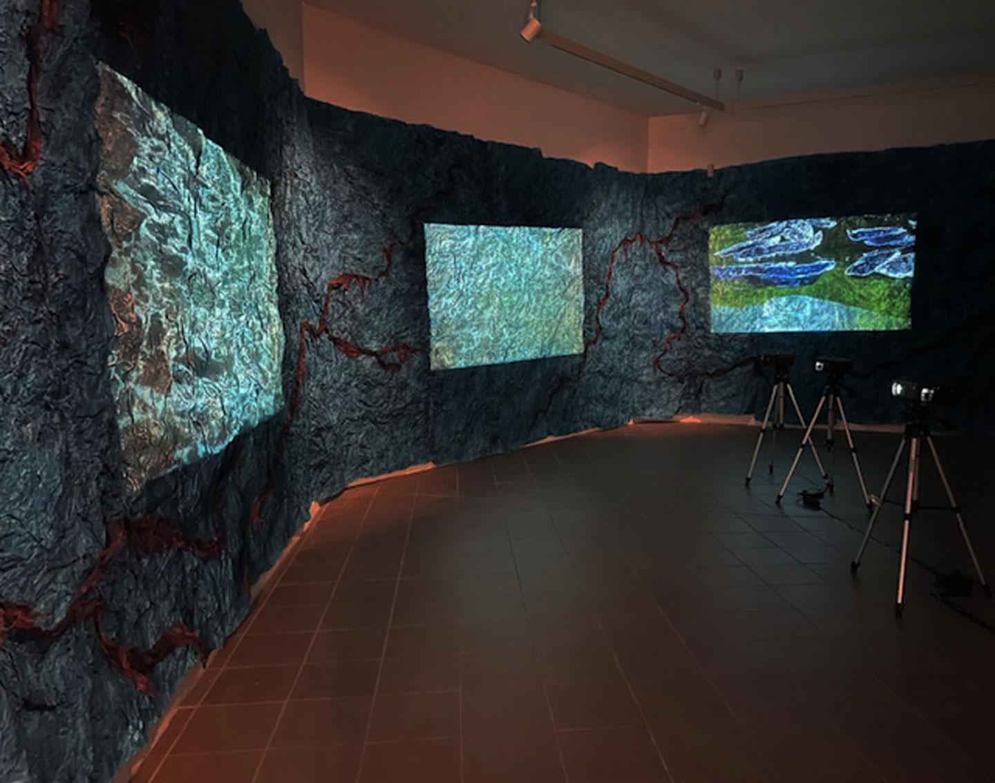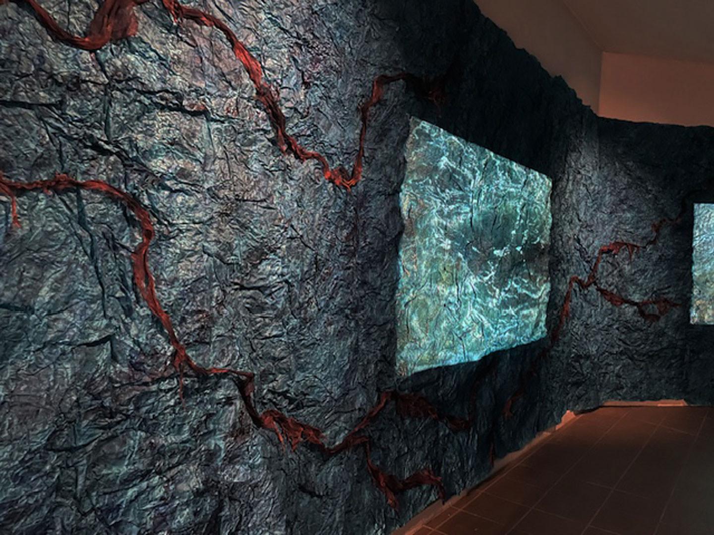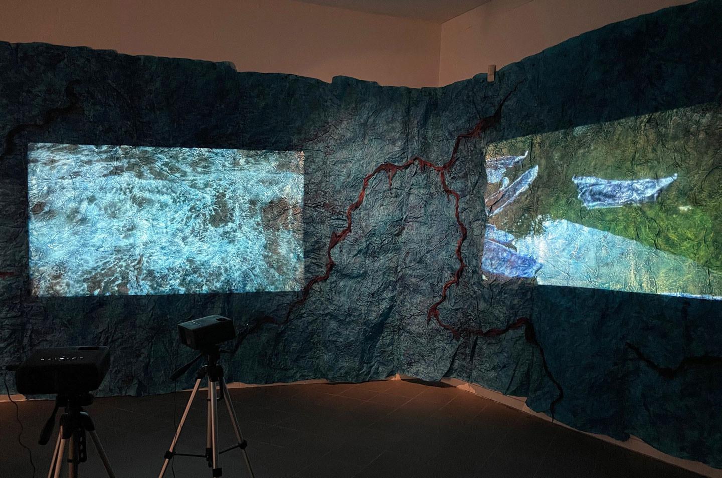 du bleu profond au blanc des crêtes, sur lequel sont projetées des vidéo d’eau en