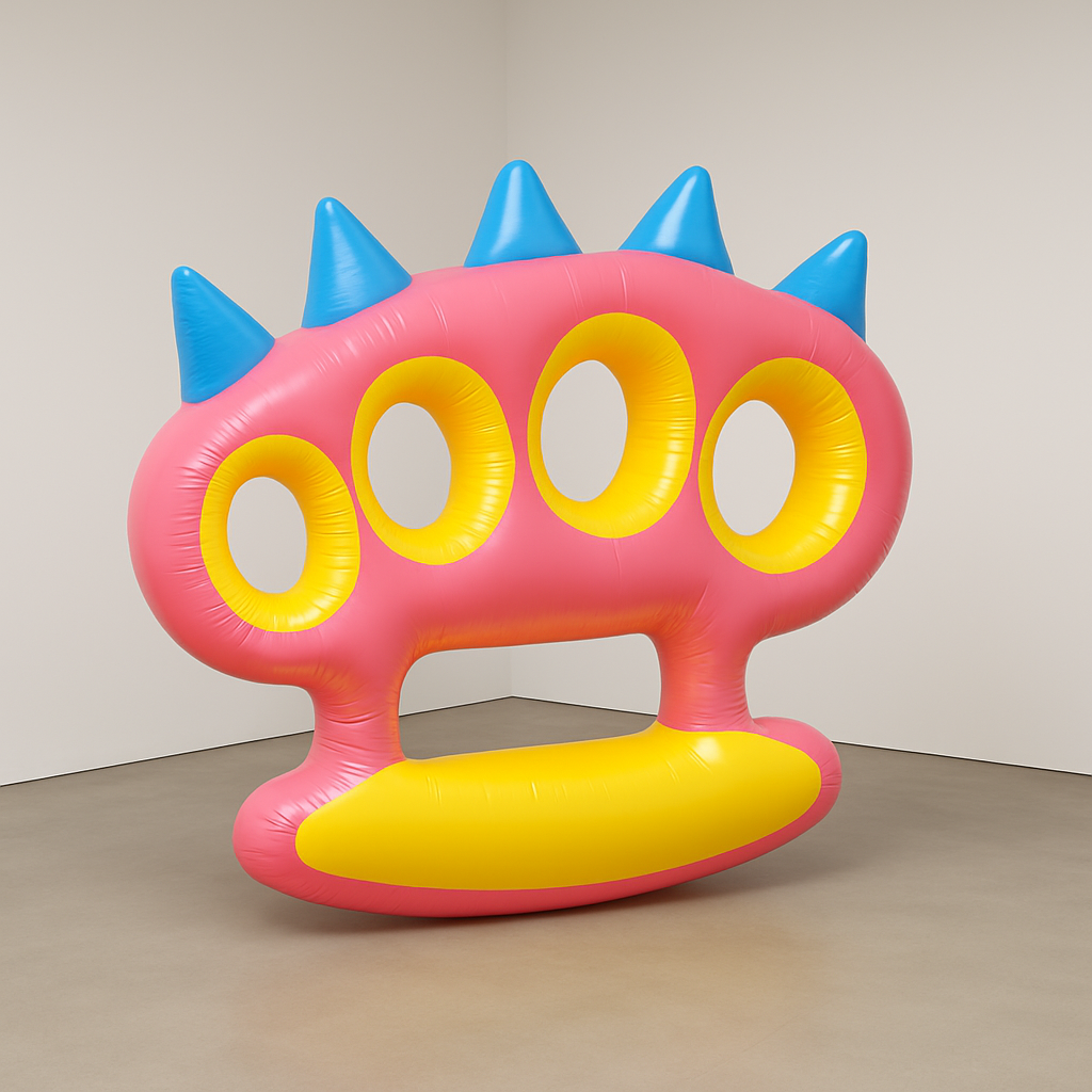The brass knuckle is brightly colored, resembling an object from a child’s coloring book—an aesthetic choice that heightens the tension between its playful appearance and its brutal symbolism. This contrast speaks to the naive and misguided nature of violence and how it is often trivialized or aestheticized in contemporary culture.
