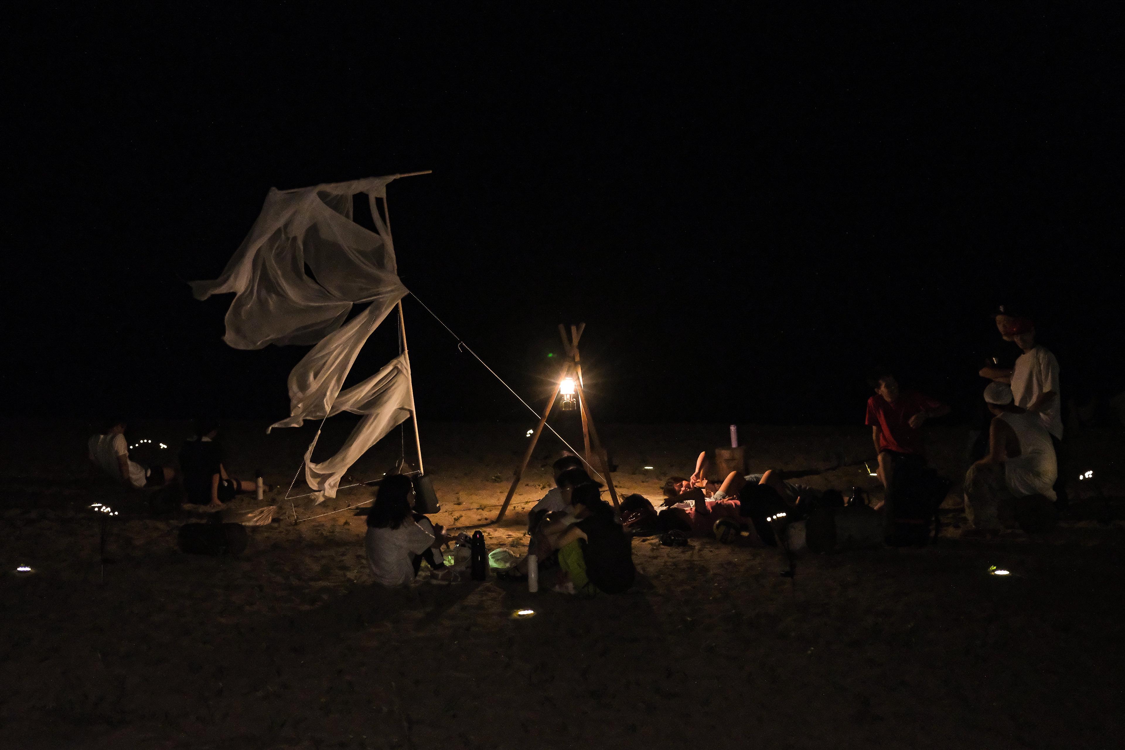 Drawn by the sound of wind chimes, people orient themselves by the light and make their way to the device.