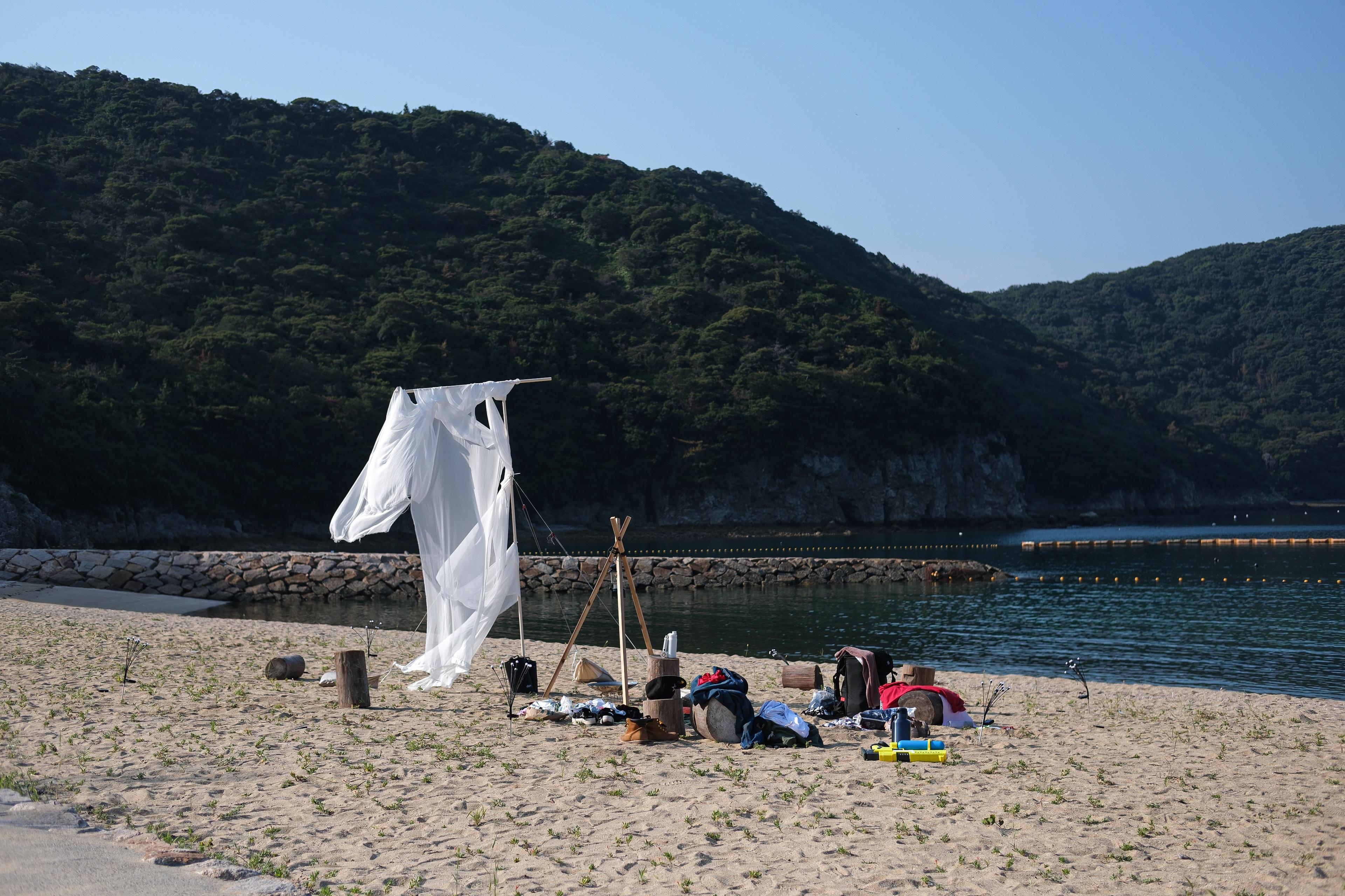 This work is an installation placed at the center of the space for Mujinto100FES, a music festival held on Nishijima in the Ieshima Islands of the Seto Inland Sea, Japan. The festival—organized and hosted by the artist—brings together about 150 participants who live communally for four days and three nights, opening themselves to one another through music, dialogue, and shared routines.