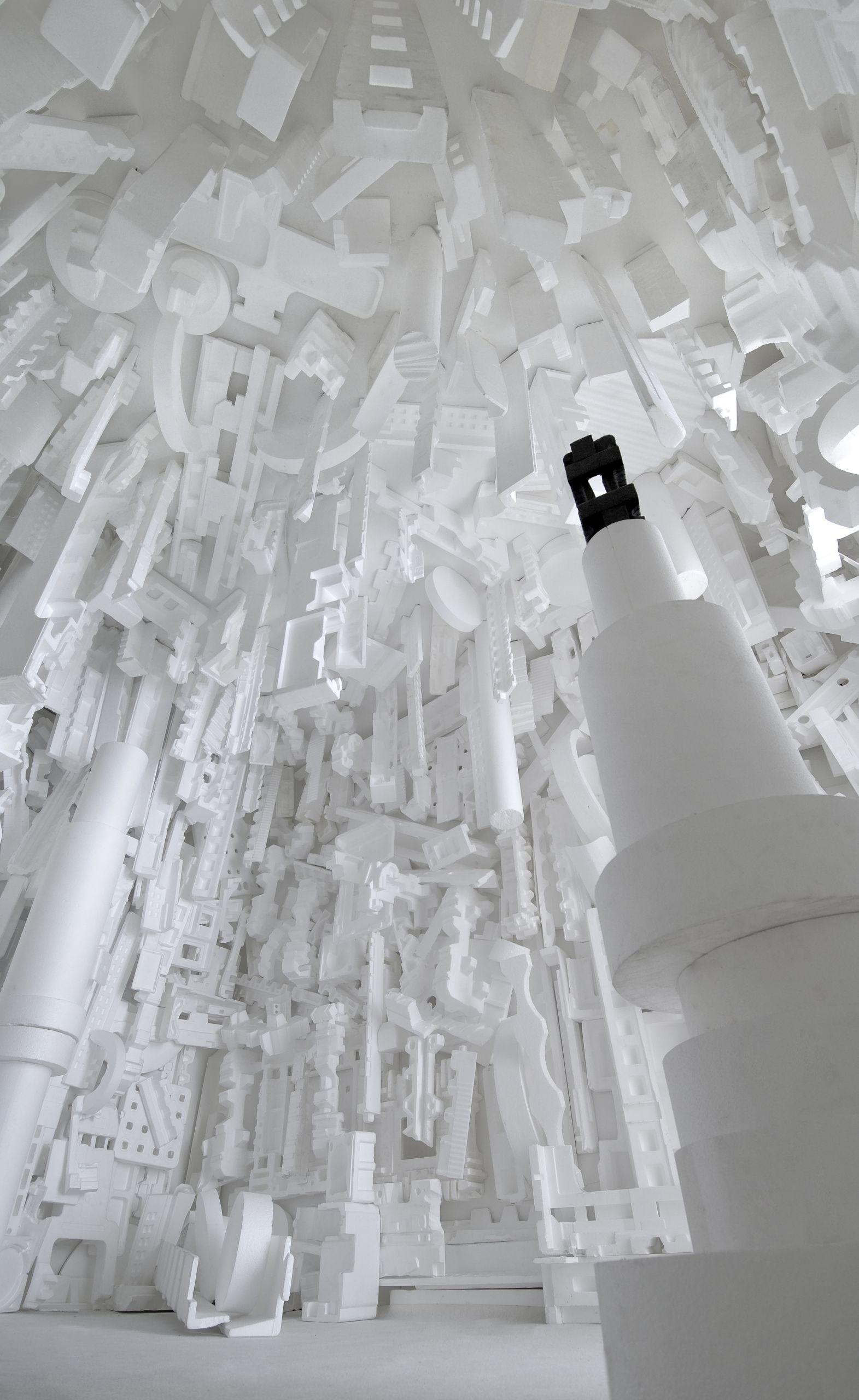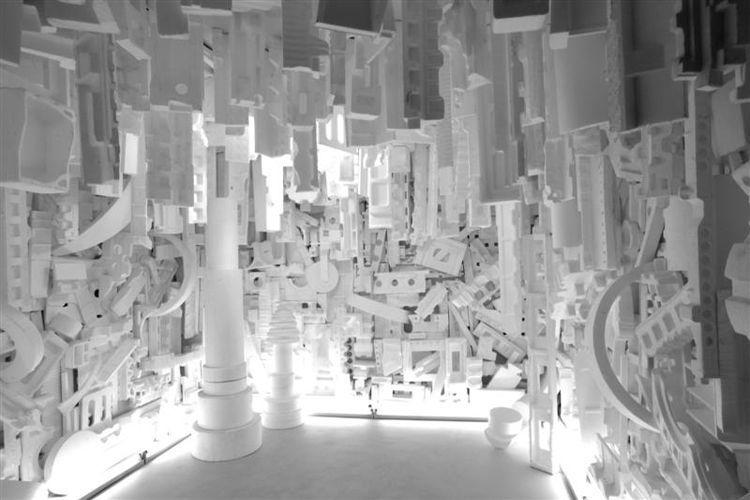 The site specific installation, blends futuristic architecture and ancient cultures, fantasy and reality. The 3 dimensional spaces all in white, combining positive and negative forms, play a lofty mystical role. The imagery seem to refer and combine various aesthetics that draw inspiration from a range architectural period in the history of mankind, like a journey in time. The artist's motivation is to describe and envision how a future world will look like after a horrific disaster will ruin the world as we know it.