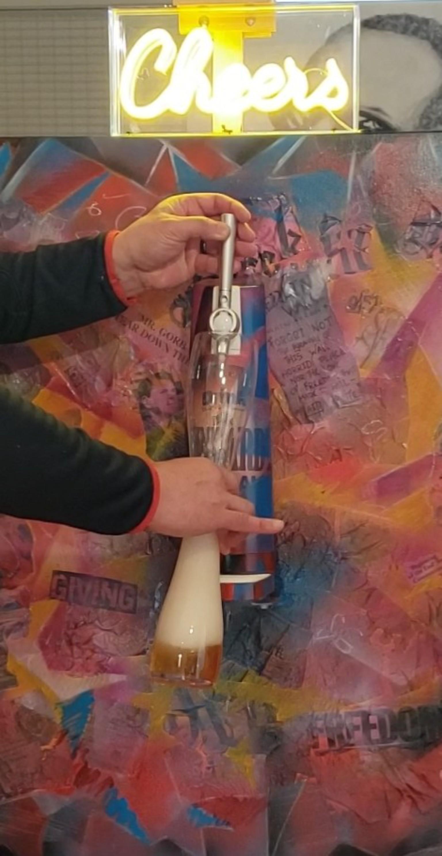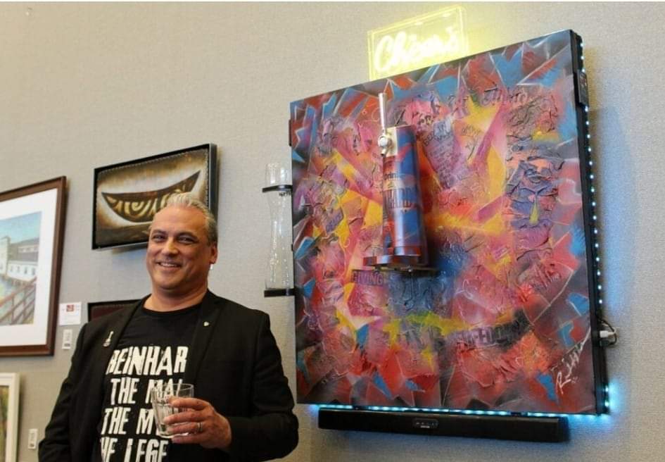Beer Tap Painting that actually pours beer. A self-contained working device operates by batteries. Theme is an abstract acrylic collage graffitied style painting of the Fall of the Berlin Wall.