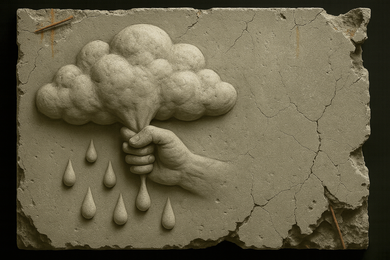 The cracked surface, rusty rebars, and eroded edges transform the poetic gesture into a symbol of human control over nature, questioning our attempts to exploit even the most intangible resources.
