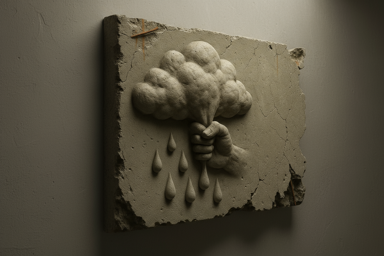"Cloud Milking" is a concrete bas-relief depicting a hand grasping a cloud as if it were an udder, squeezing raindrops from it.