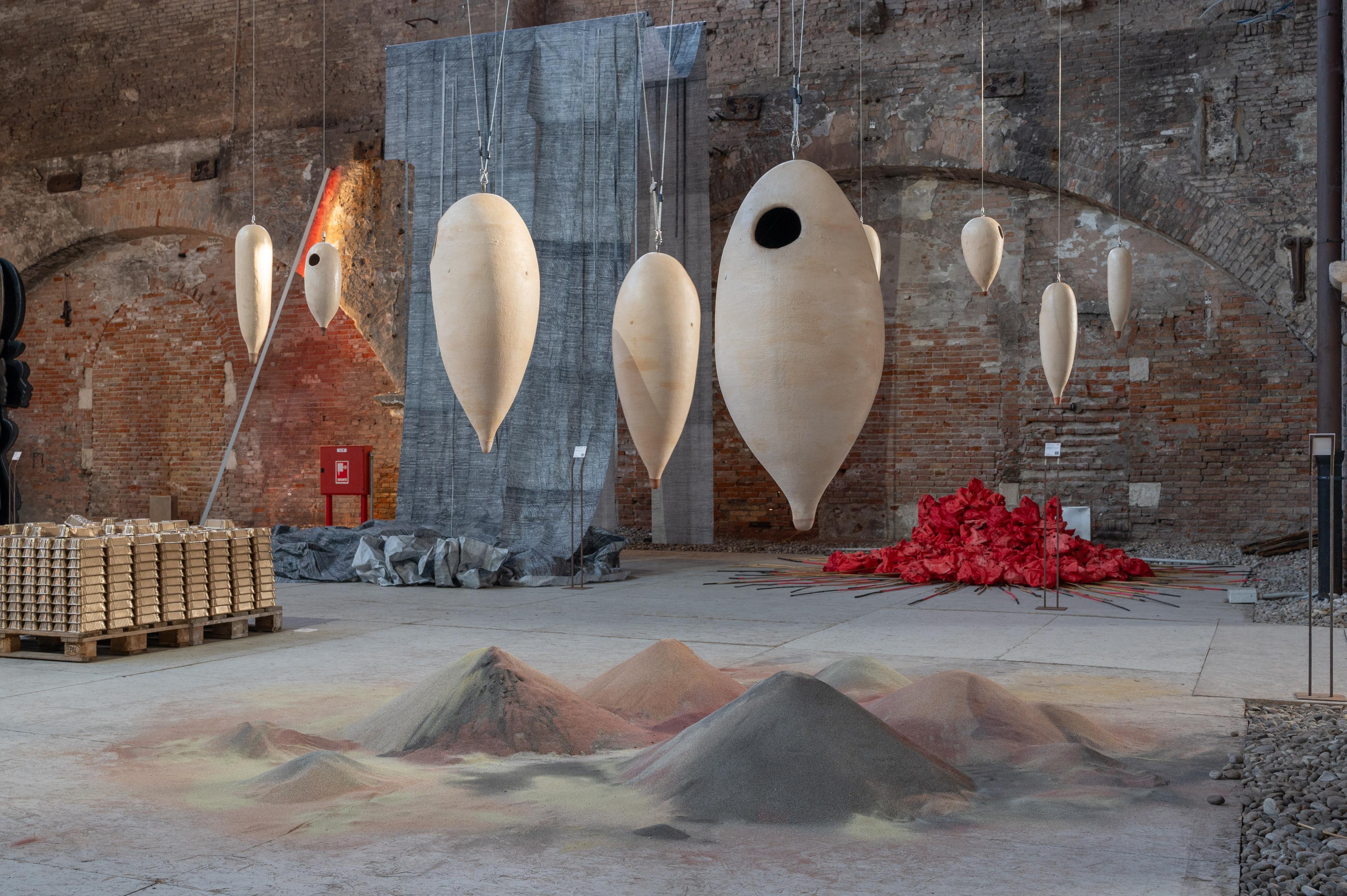 The suspended forms suggest seeds, cocoons or nests—symbols of shelter, gestation and renewal. Their gradual dispersal of pigment engages gravity as both physical and metaphorical force, a choreography of erosion and emergence that challenges ideas of permanence and control.