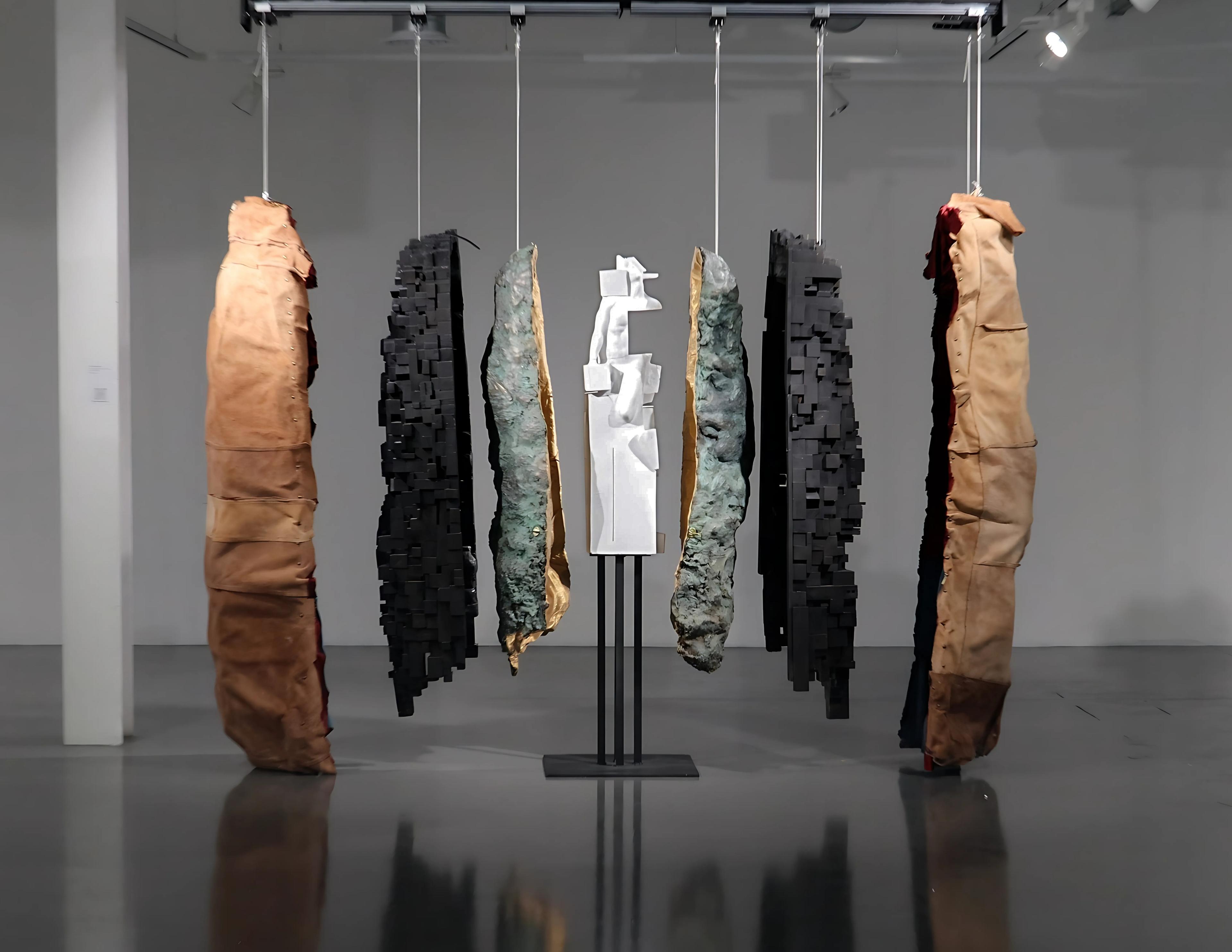 At its core lies a marble body inscribed with words written in pencil, pen, and engraved into the stone. Each technique represents a different temporality: pencil fades, ink resists, engraving persists to be revealed by time. Around this nucleus unfold successive shells: bronze resin with silk, recalling crystallised memory and intimacy; wood, embodying grounding and structure; and leather as the outer skin, symbolising the mask of identity. The sliding system allows the layers to expand or contract, making the work both architectural and performative. The combination of noble and organic materials—marble, bronze, leather, wood, silk—reflects Muratore’s hybrid practice, merging traditional carving with experimental processes.