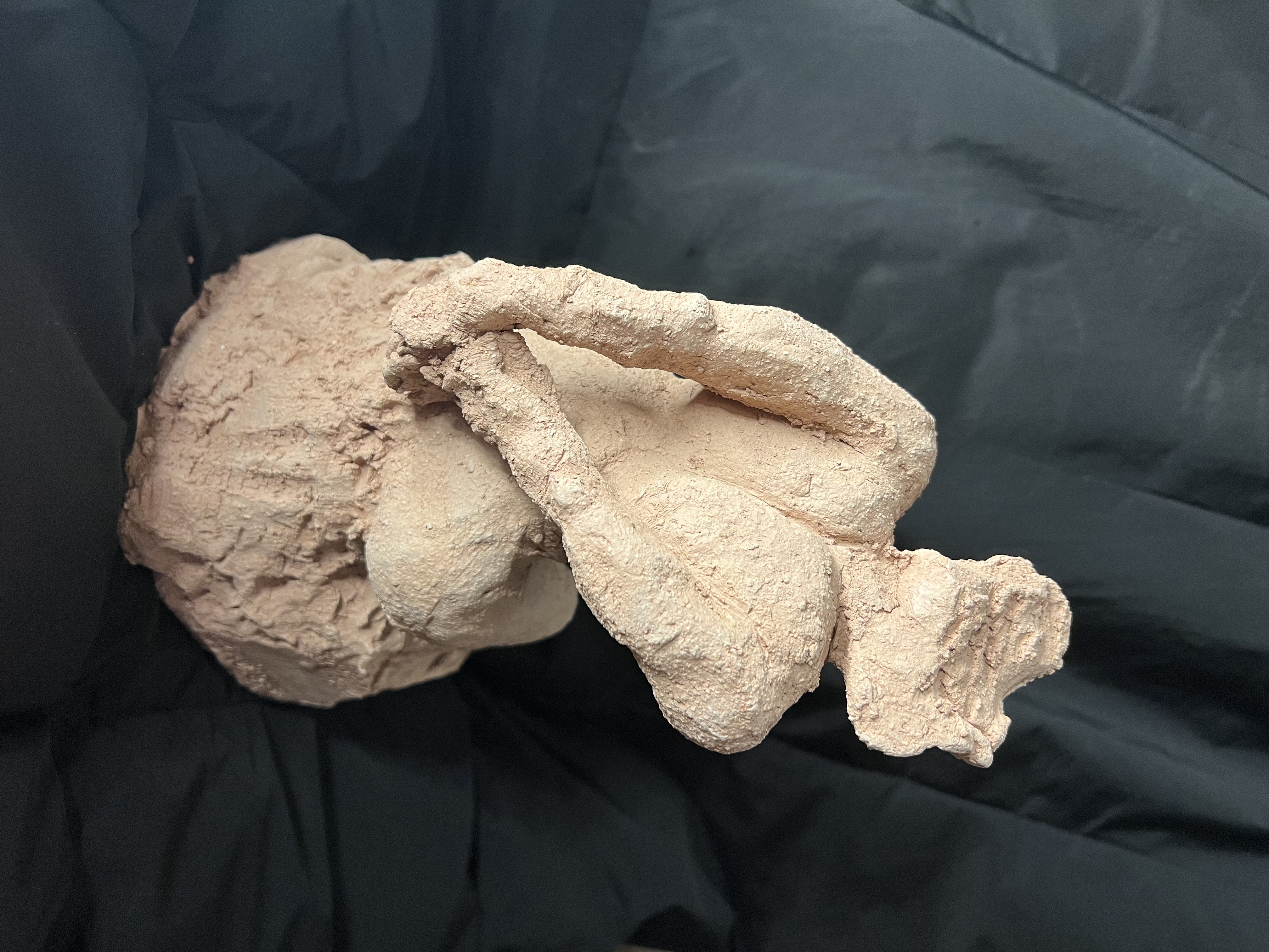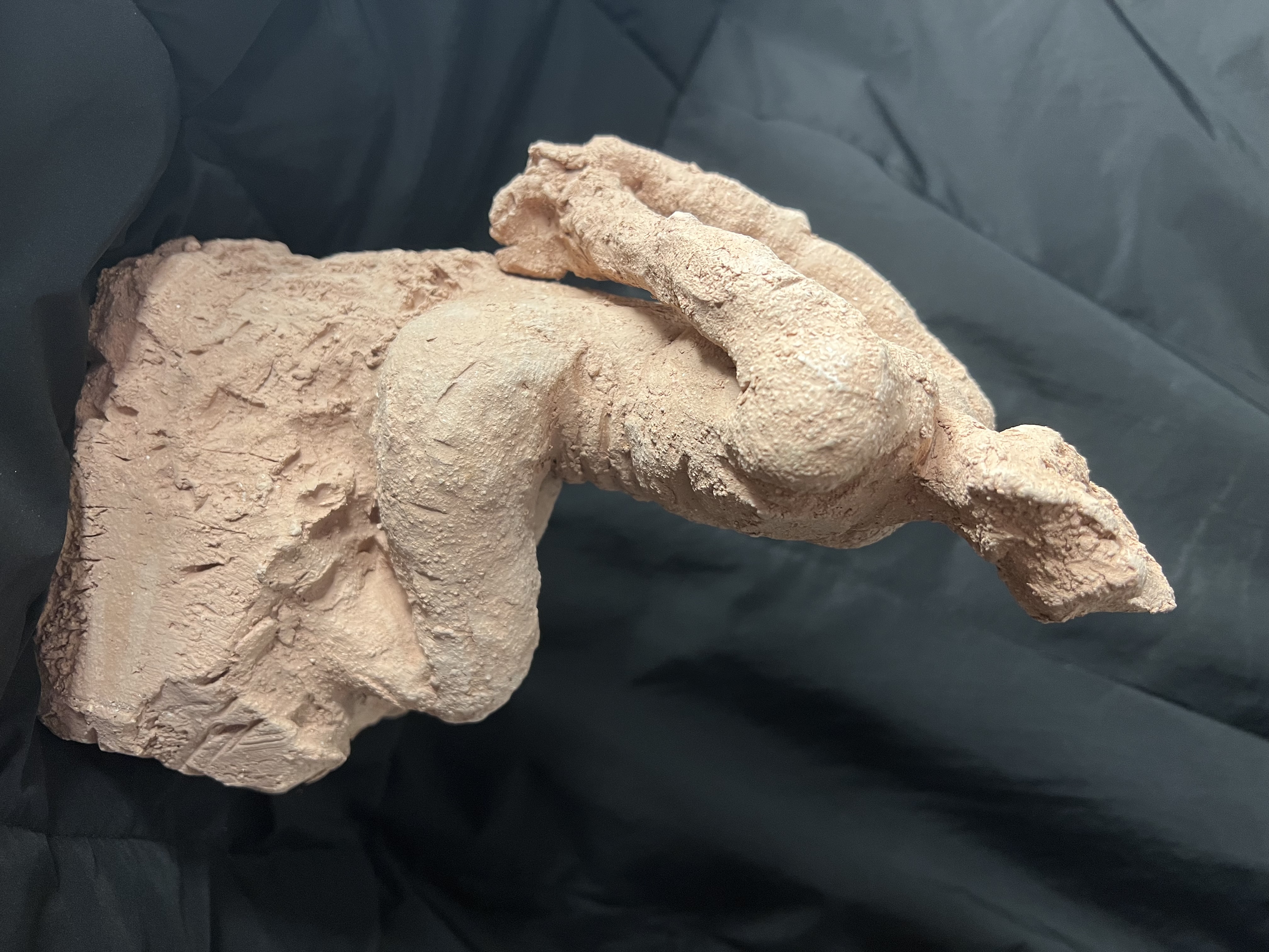 Headless, faceless, the being turns inward and upward, caught in an eternal gesture of yearning. It is not a body at rest, but a battlefield of opposites: strength pressed against fragility, desire against denial, expansion against confinement. The rough, broken texture of the surface mirrors the inner abrasion of these irreconcilable energies grinding against each other.