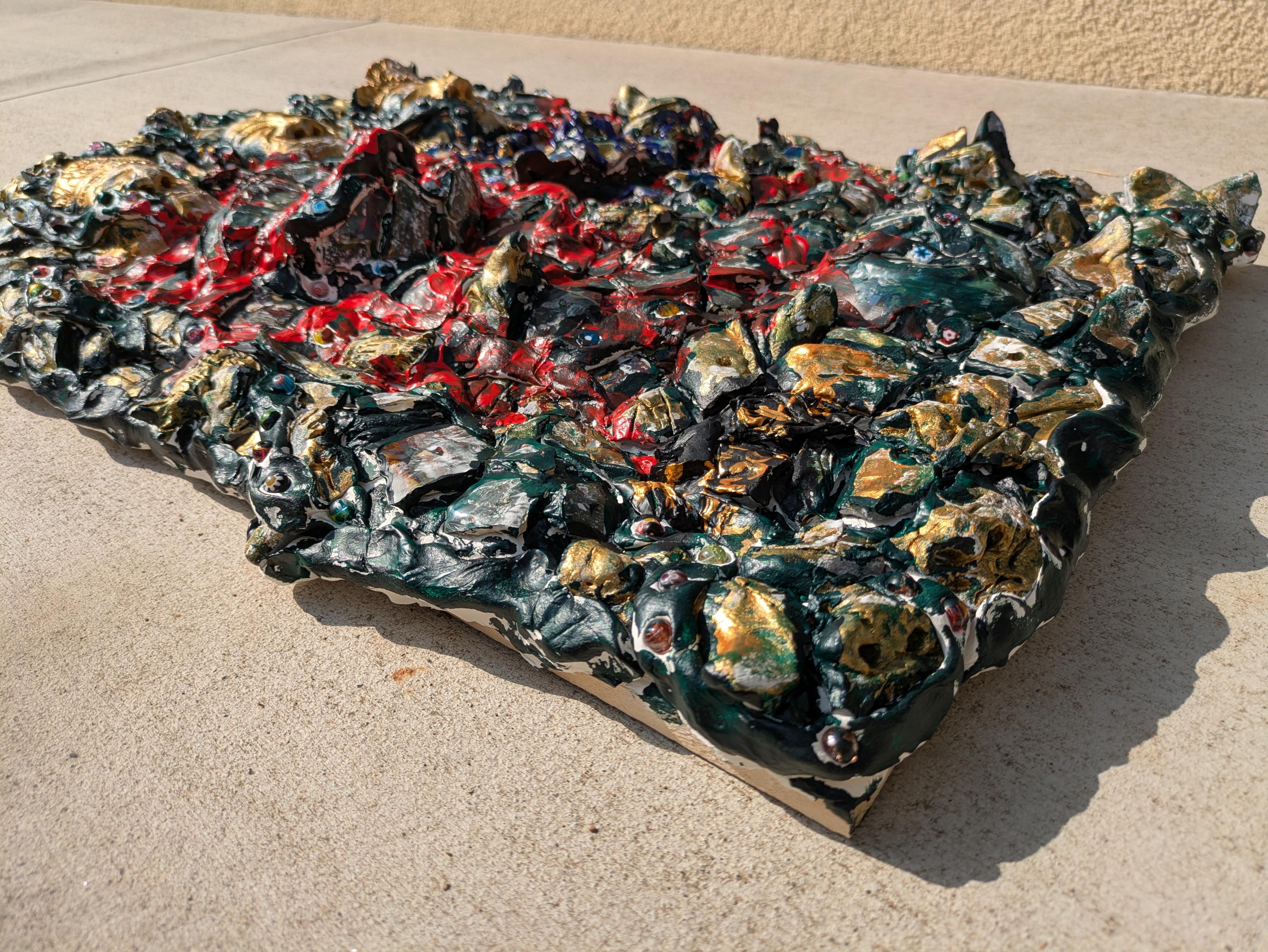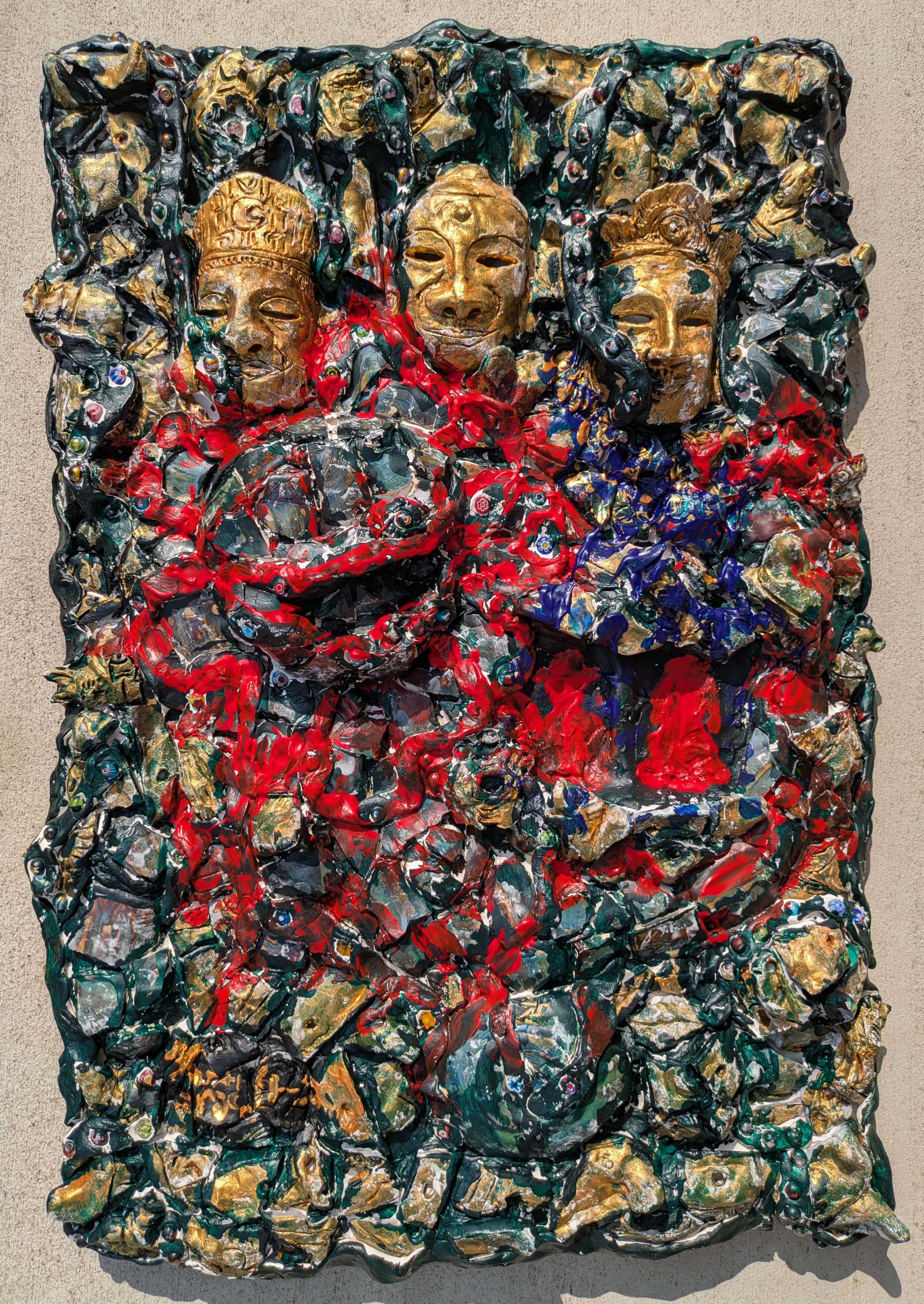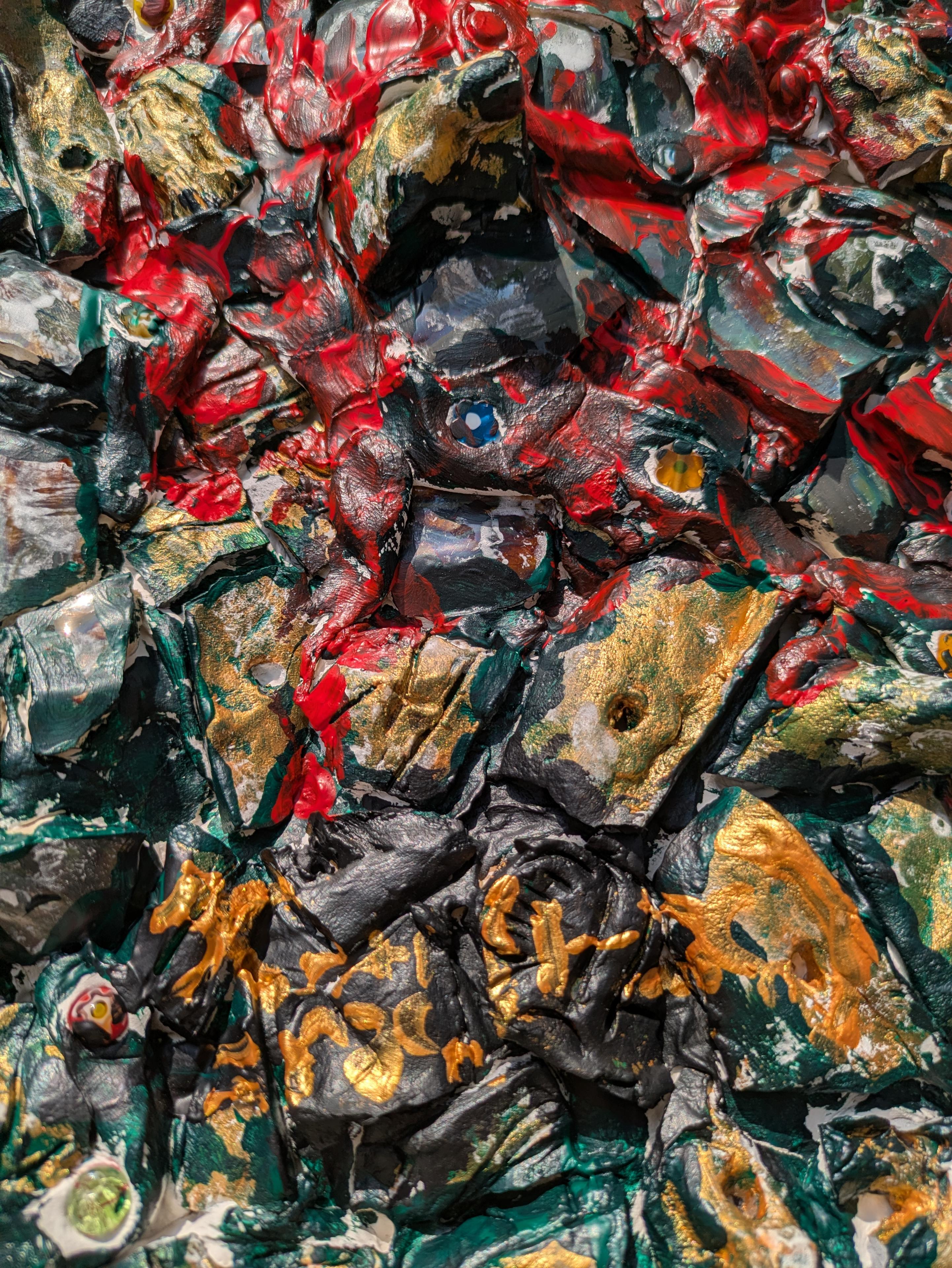Crowned in Ruin is a highly textured wall relief composed of broken ceramic forms mounted onto a wooden panel. At its center are three crowned figures—part deity, part relic—emerging from a fractured surface awash in red, gold, and green. These faces stare out from a vortex of ceremonial decay, surrounded by countless smaller fragments and cryptic markings.