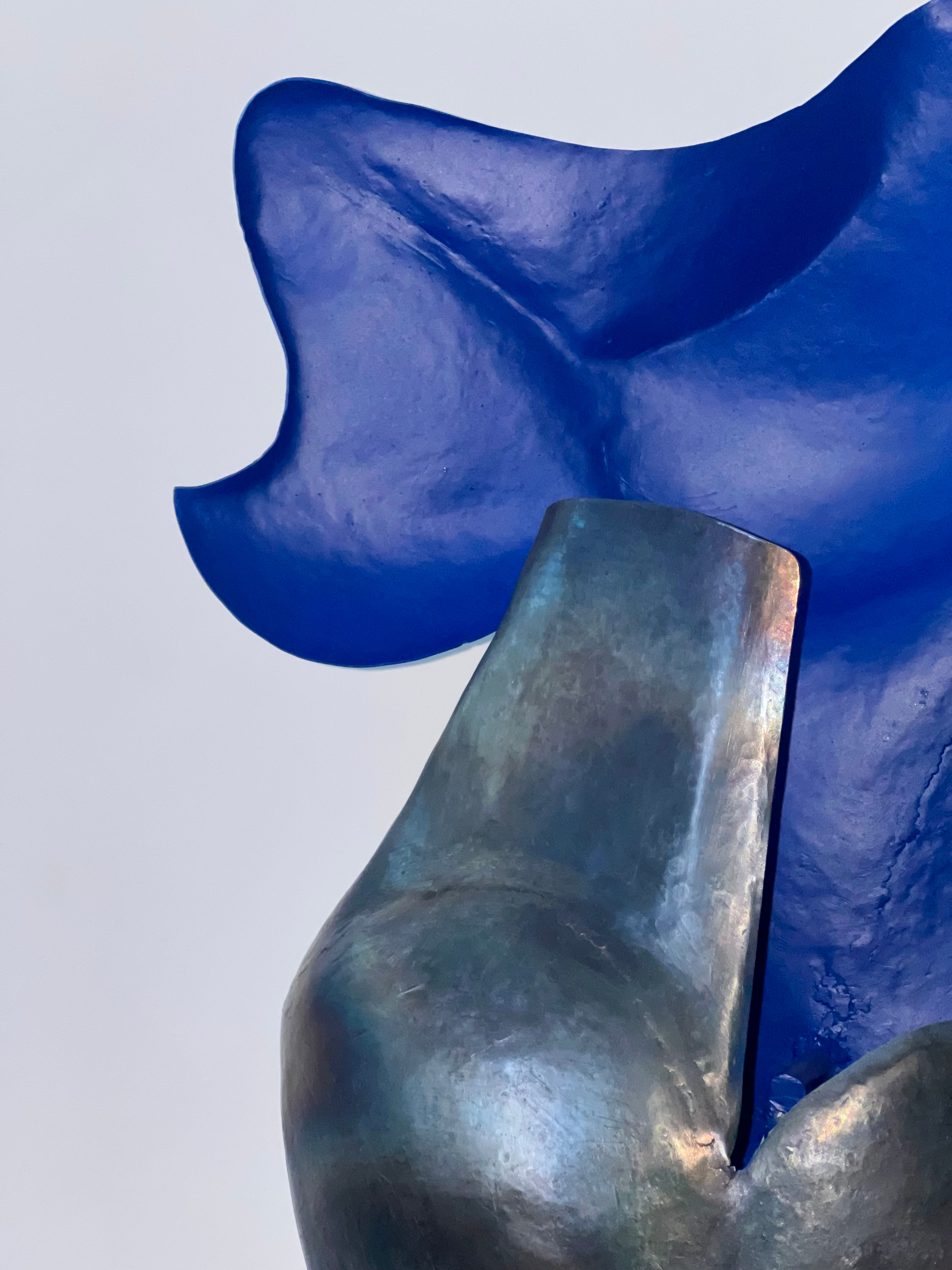The blue opening within disrupts the solidity of the outer shell and introduces a more intimate, almost secret dimension: a space of emotional depth that contrasts with the hardness of the exterior and destabilises its reading. In this fracture between exterior and interior, between weight and openness, the sculpture builds a reflection on the body as an archive of memory, identity, and transformation, proposing a beauty that is non-normative, yet conscious, complex, and contemporary.