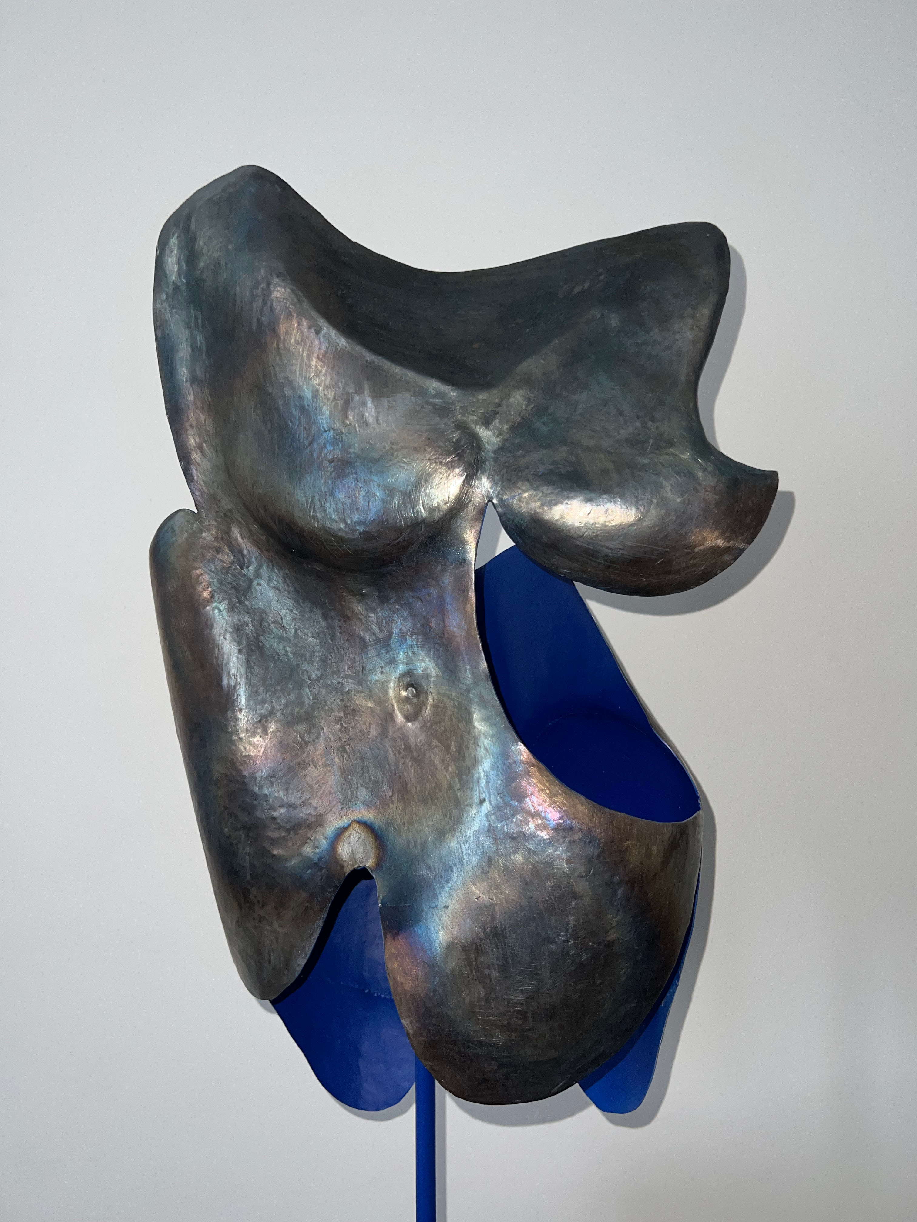 Dentro Blu interrogates the female body as a territory of tension between exposure and resistance. Made in wrought iron, the sculpture rejects any idea of formal perfection in order to affirm a corporeal presence that is marked, fragmented, and yet full of strength. The metallic surface, with its shifting reflections, reveals a body that does not present itself as an idealised image, but as living matter, shaped by time, experience, and vulnerability.