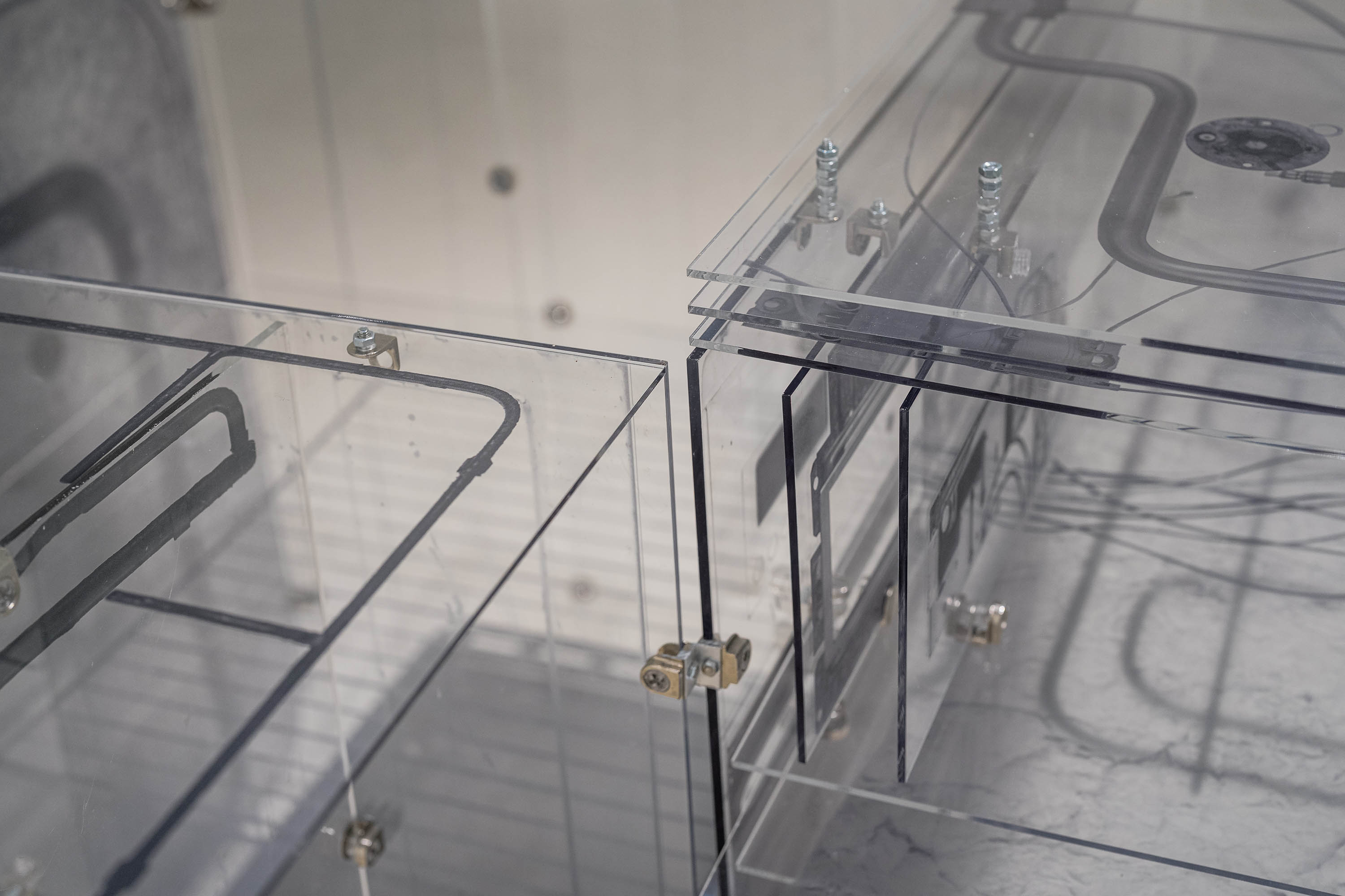 Enov is a transparent installation based on the form of a household oven, reimagined as a hollow, deconstructed object. Stripped of function, it exposes the hidden structure of the appliance, inviting viewers to reconsider their relationship with everyday technologies. The anagrammatic title subtly signals that this is no longer an oven, but an abstraction — a conceptual echo of utility, transparency, and absence.