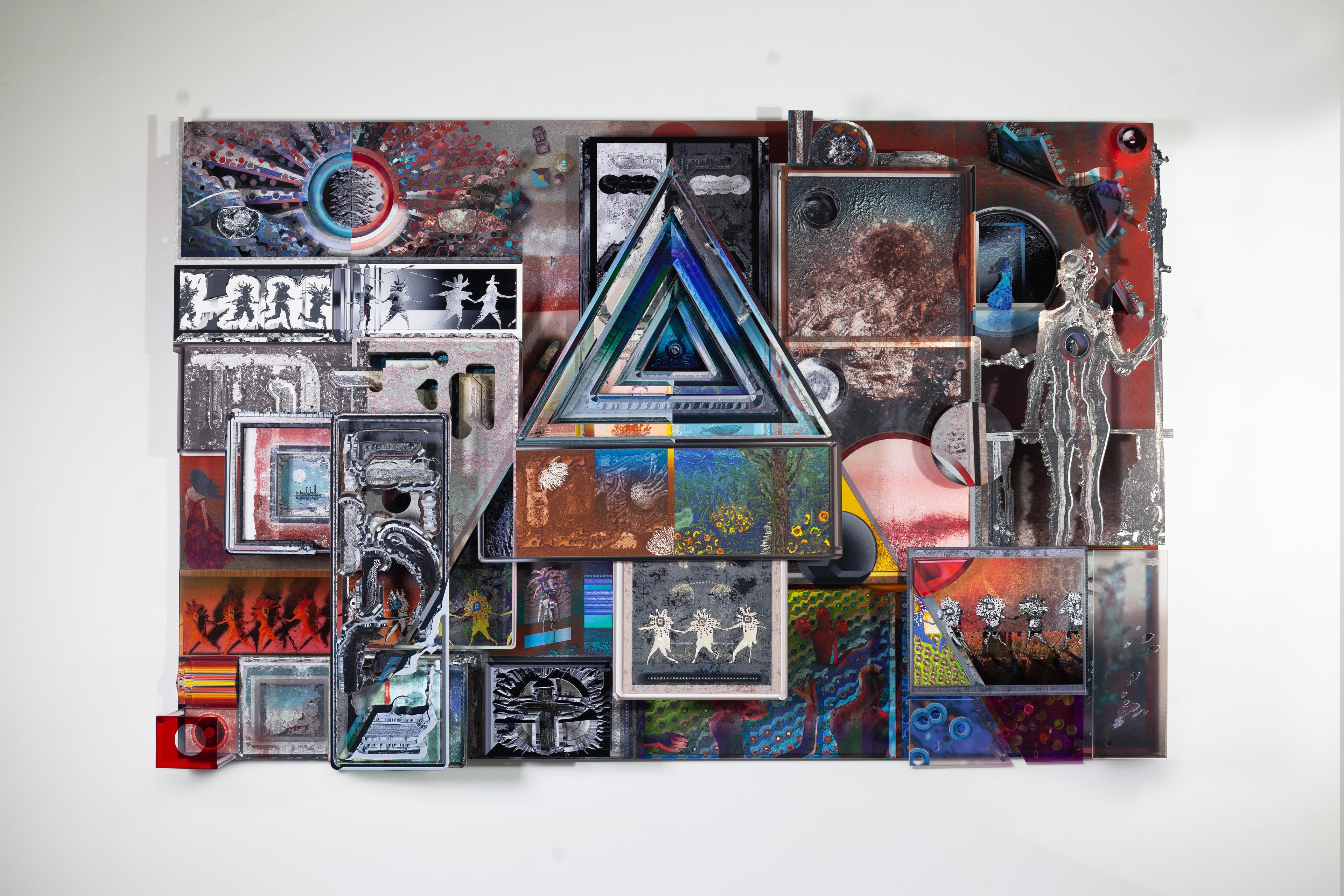 This work distinguishes itself through its technical and material complexity. Constructed from multiple physical layers, it forms a mural sculpture that blurs the boundary between painting and sculpture. Its stratified composition generates a tangible sense of depth, with each layer contributing its own texture, finish, and dimensional presence. This hybrid structure redefines the two-dimensional surface as a sculptural experience, inviting the viewer to engage spatially with the image.