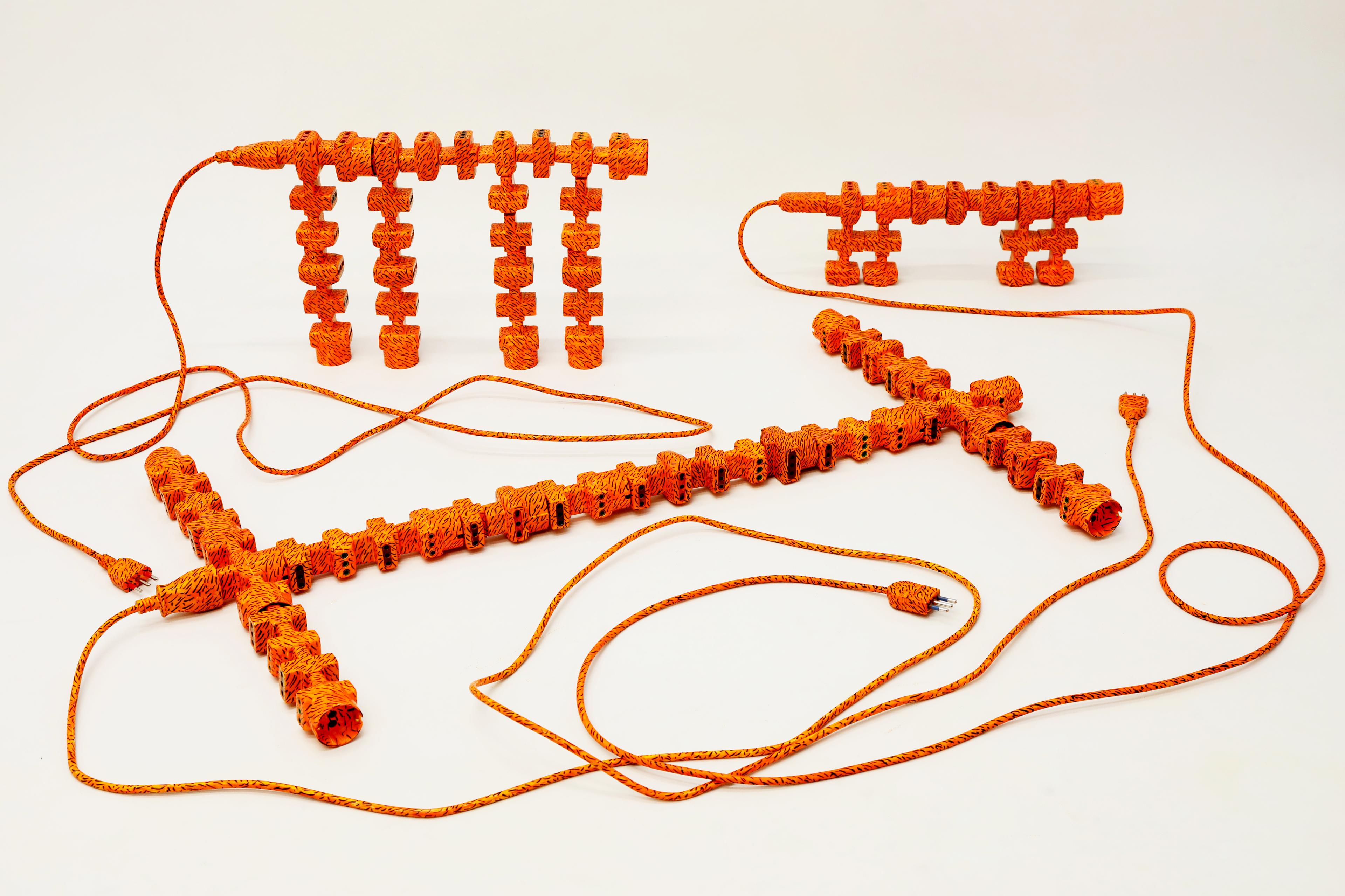The installation is composed of nine sculptures (five tigers and four crocodiles); each sculpture is made of painted plugs and extensions. A grotesque elegance and irony linger in this work, where absurd, disturbing, yet attractive elements blend together to create an imagery that appears dystopian and plausible at the same time. Technology and electronic devices offer many benefits and comforts; at the same time, what we create seems to backfire in the long run. Through a vocabulary made of fragility and danger, the artwork offers a sharp perspective to analyse the present age.