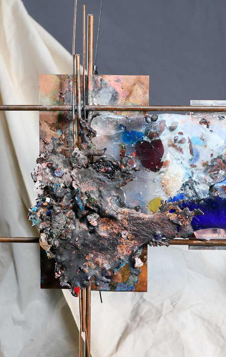 Add a touch of elegance to any space in your home with this stunning wall sculpture made of glass castings and copper splashing. A glass casting with embedded multi-colored glass is the starting point for the entire beauty that is achieved by adding recycled copper splashes, extra copper bits, and glass.