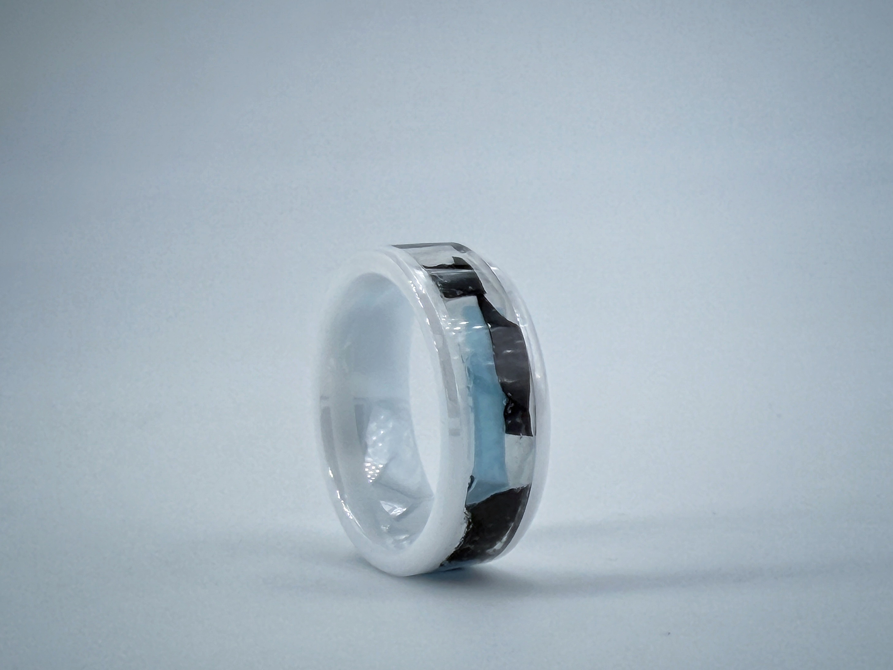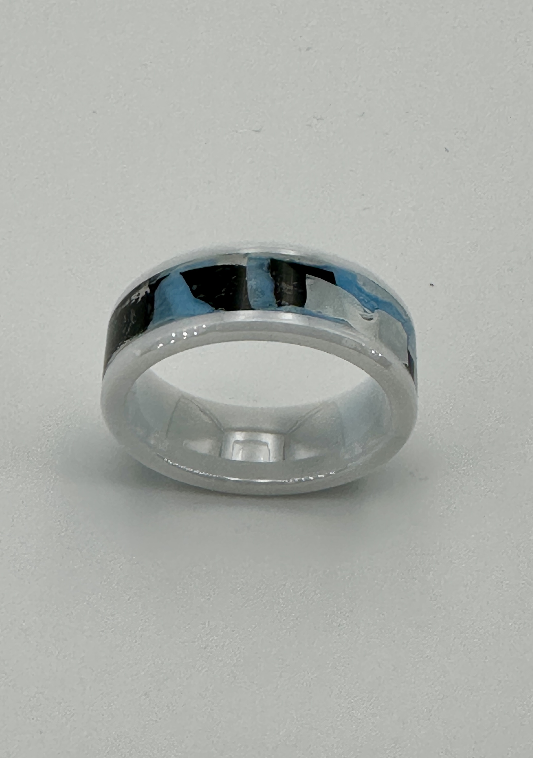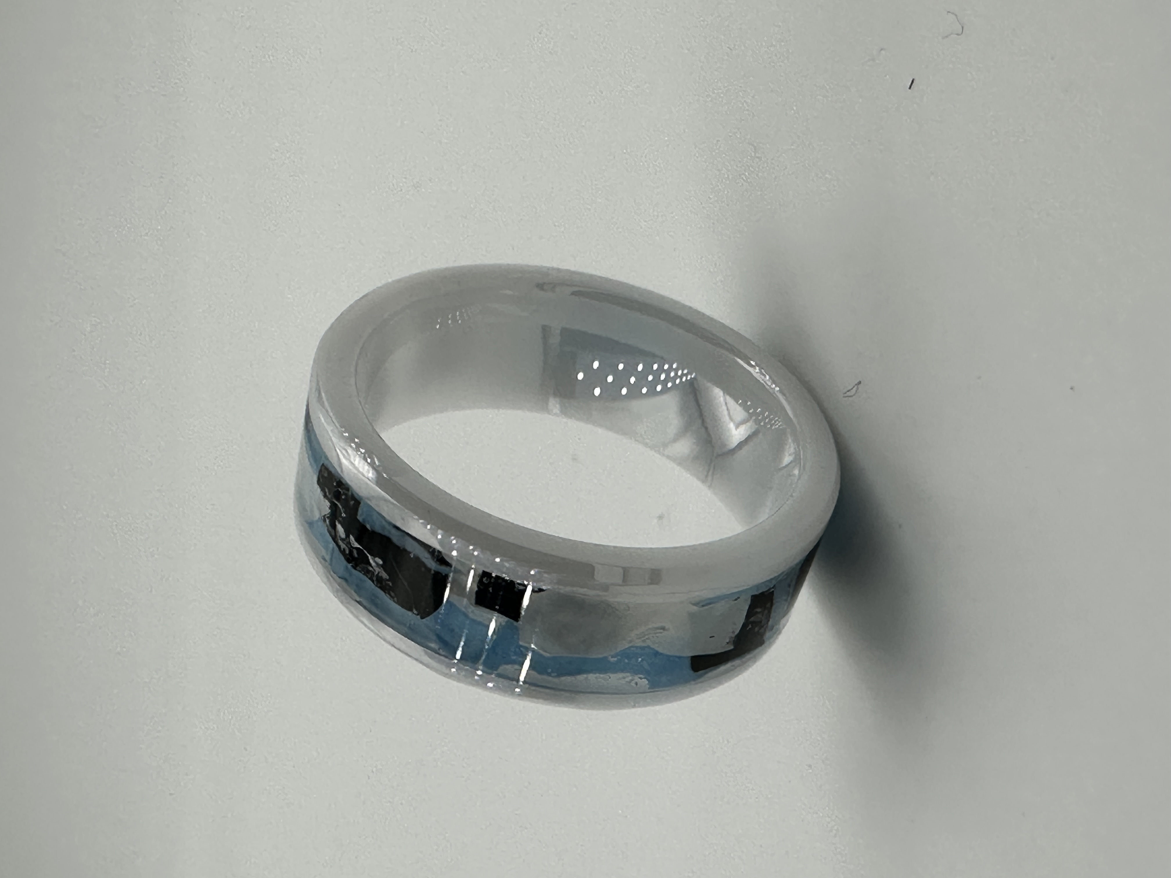 It was created from a white ceramic ring base, reshaped and polished by hand, with fragments of torn latex gloves in blue, white, and black embedded in cyanoacrylate adhesive.