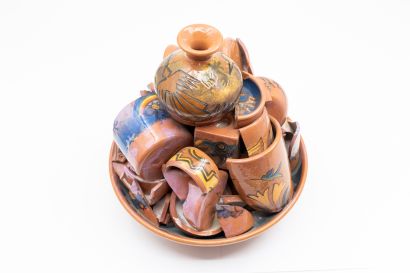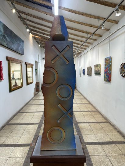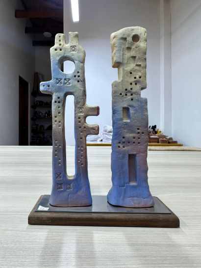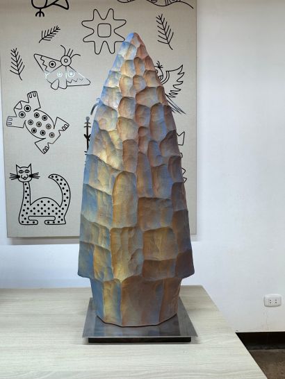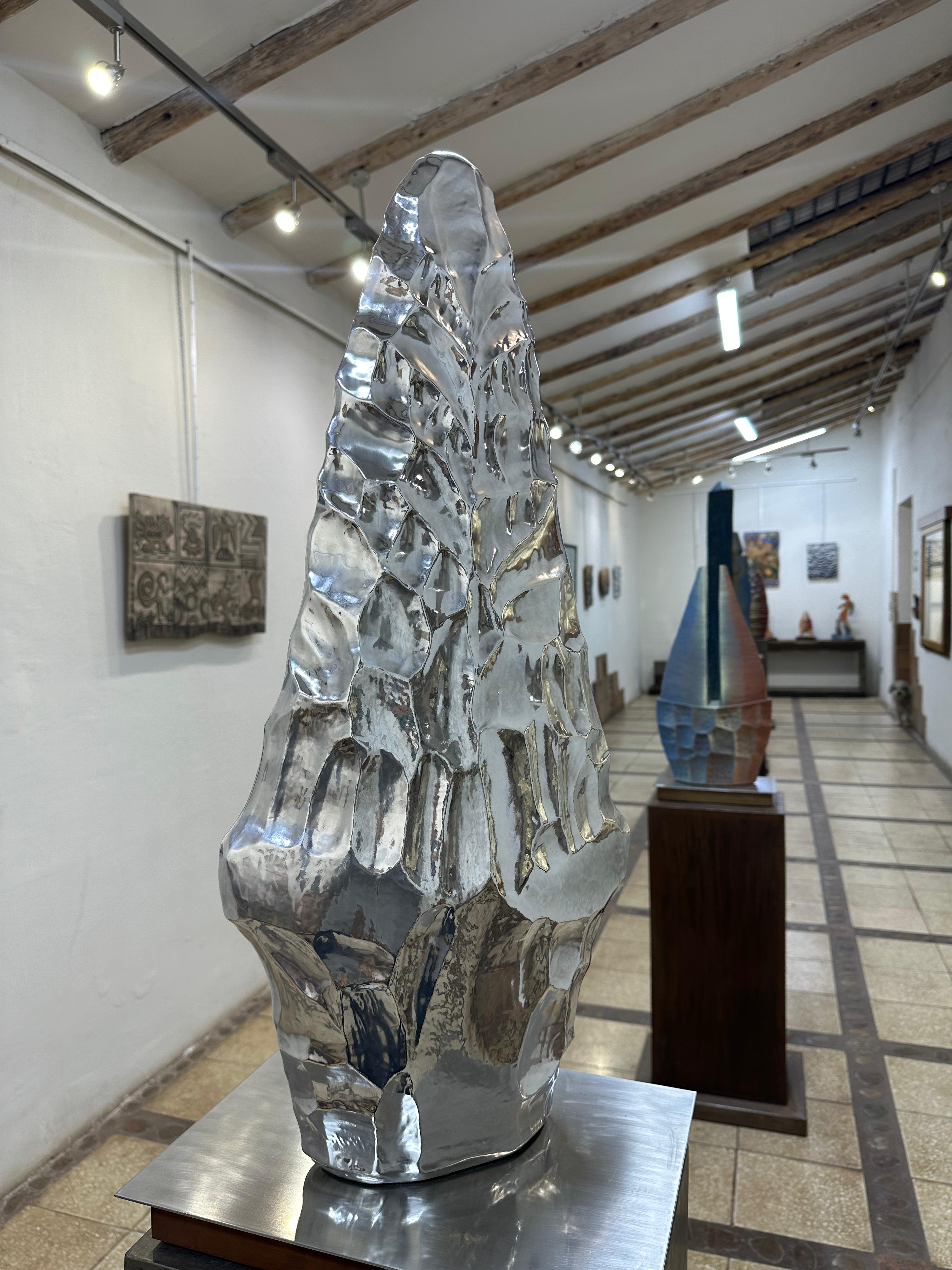 Celestial Arrow is an aluminum sculpture created from an original ceramic work that was 3D scanned and subsequently carved using CNC technology. The process transfers an ancestral, manual, and symbolic language into an industrial and contemporary material, preserving the formal memory and trace of its origin. Its faceted, monolithic form and reflective surface evoke ancient artifacts while engaging digital precision, reflecting on the transformation of tradition through technology and the persistence of form beyond material.