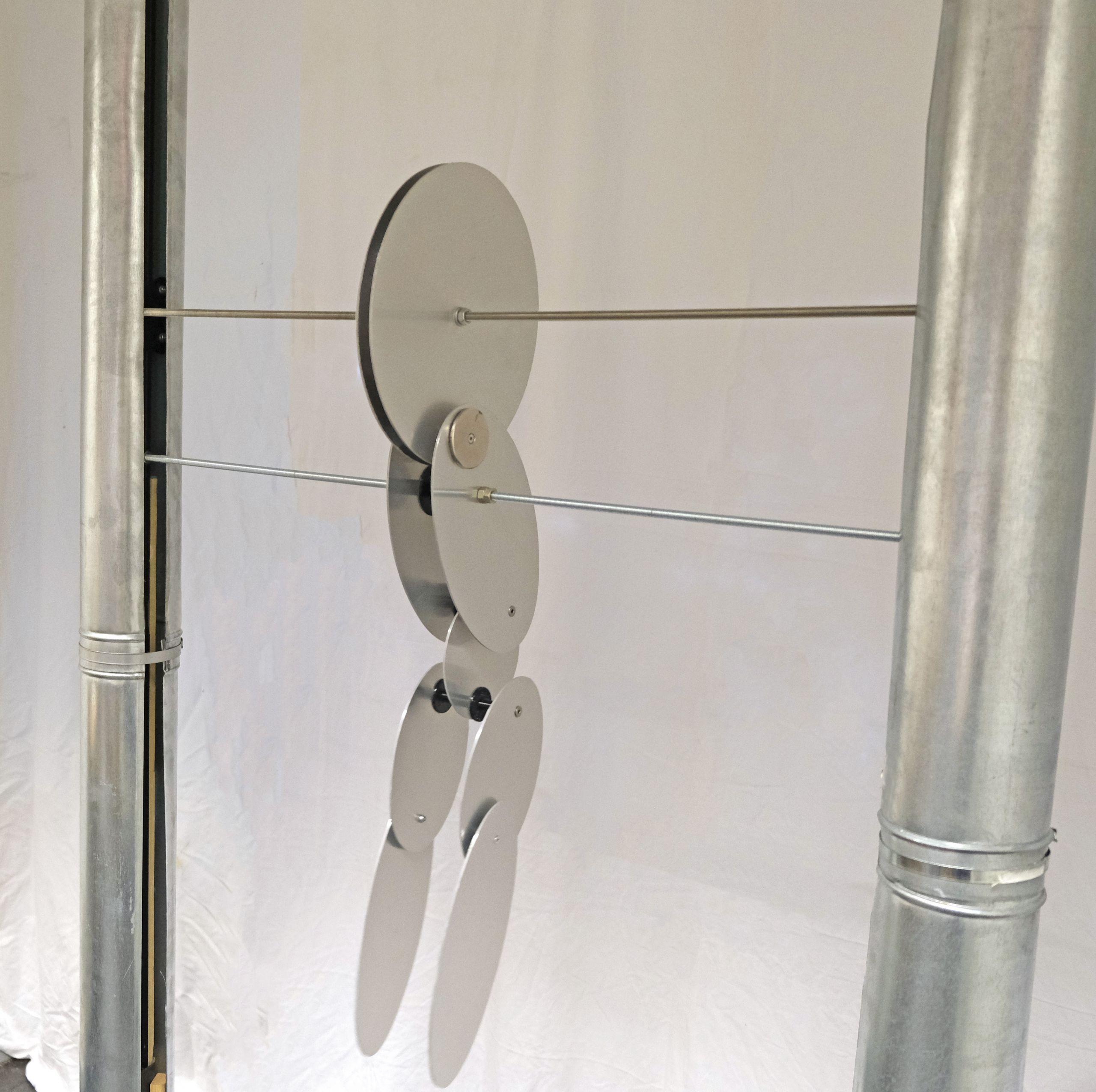 Der eine Teil wird mit einem vergleichbaren Mechanismus wie im 3D-Druckverfahren rhythmisch angesteuert, während der andere diesen Bewegungsanweisungen Folge leistet. Im Zusammentreffen entstehen aufgrund verschiedener Geschwindigkeiten unterschiedliche Bewegungsformen. Jene umschreiben die Bestimmungsarten des Magnetrads genauer. Beide Figurteile bestehen aus Alucobond, ein leichte, stabile Verbundplatte aus Kunststoff und Aluminium, mit technoider Anmutung.