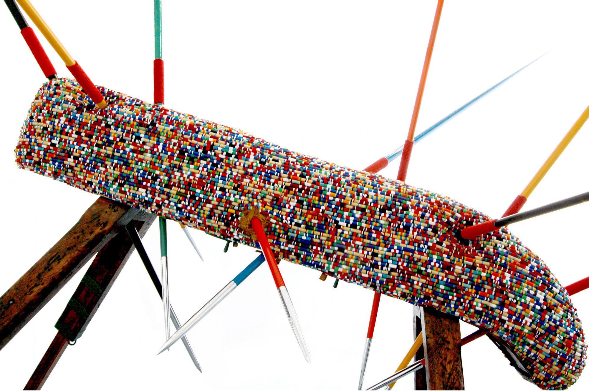 Mascot symbolies Dwight D. Eisenhower concept of the Military Industrial Complex. The gymnasium vaulting horse was selected due to its historical use in the European military since the 15th century. The military ribbons that adorn the vaulting horse were selected from specific wars of the 20th and 21st centuries that represented not only military rank, status and hierarchy through colour coding but also the occupation and resources of specific countries. The junior sport javelins represented voodoo pins and the vaulting horse the voodoo doll. The work represents the wounding of the Military Industrial Complex’s through ceremonial ritual.