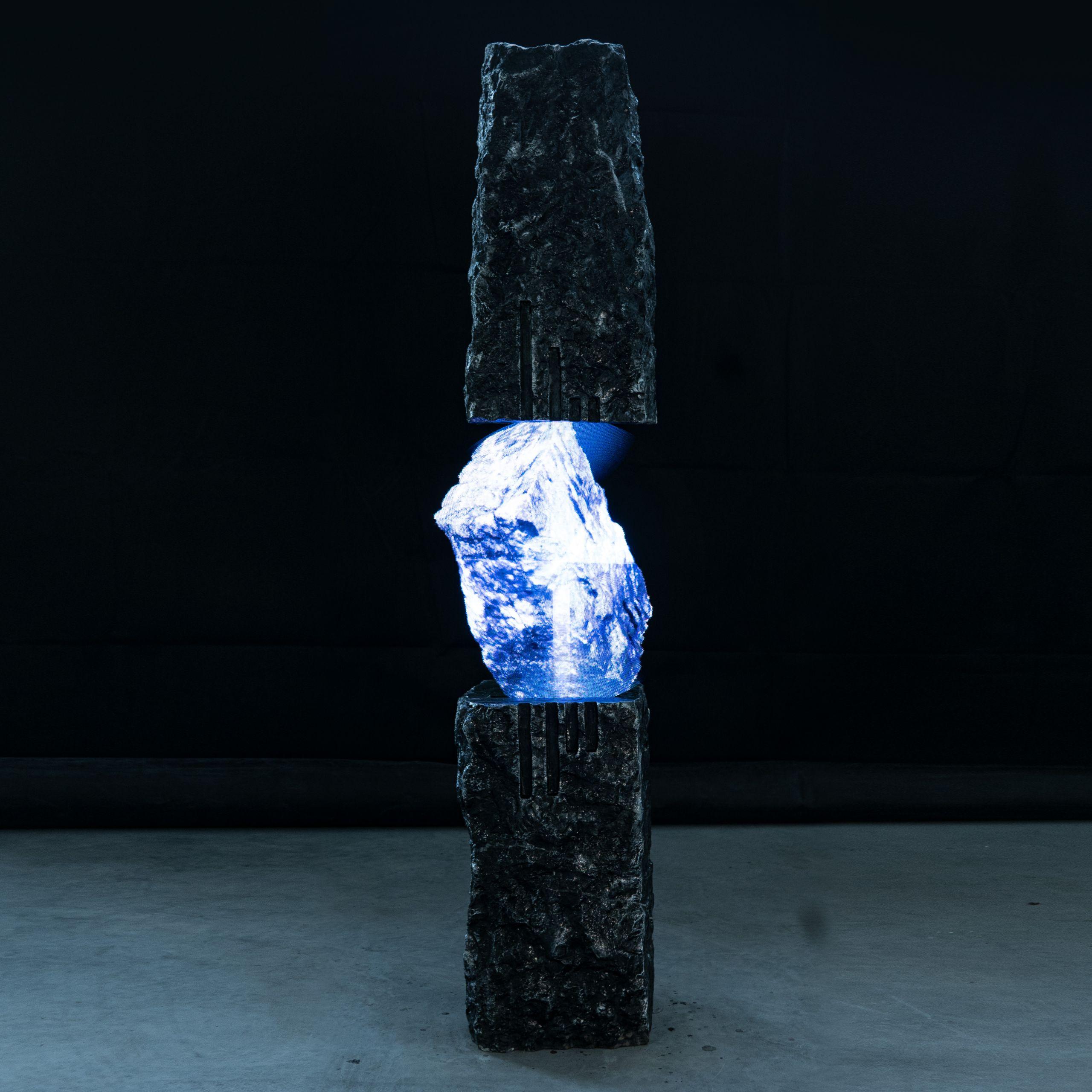 - Yingde stone, stainless steel, aluminium pigments, LED fan hologram, NFT -