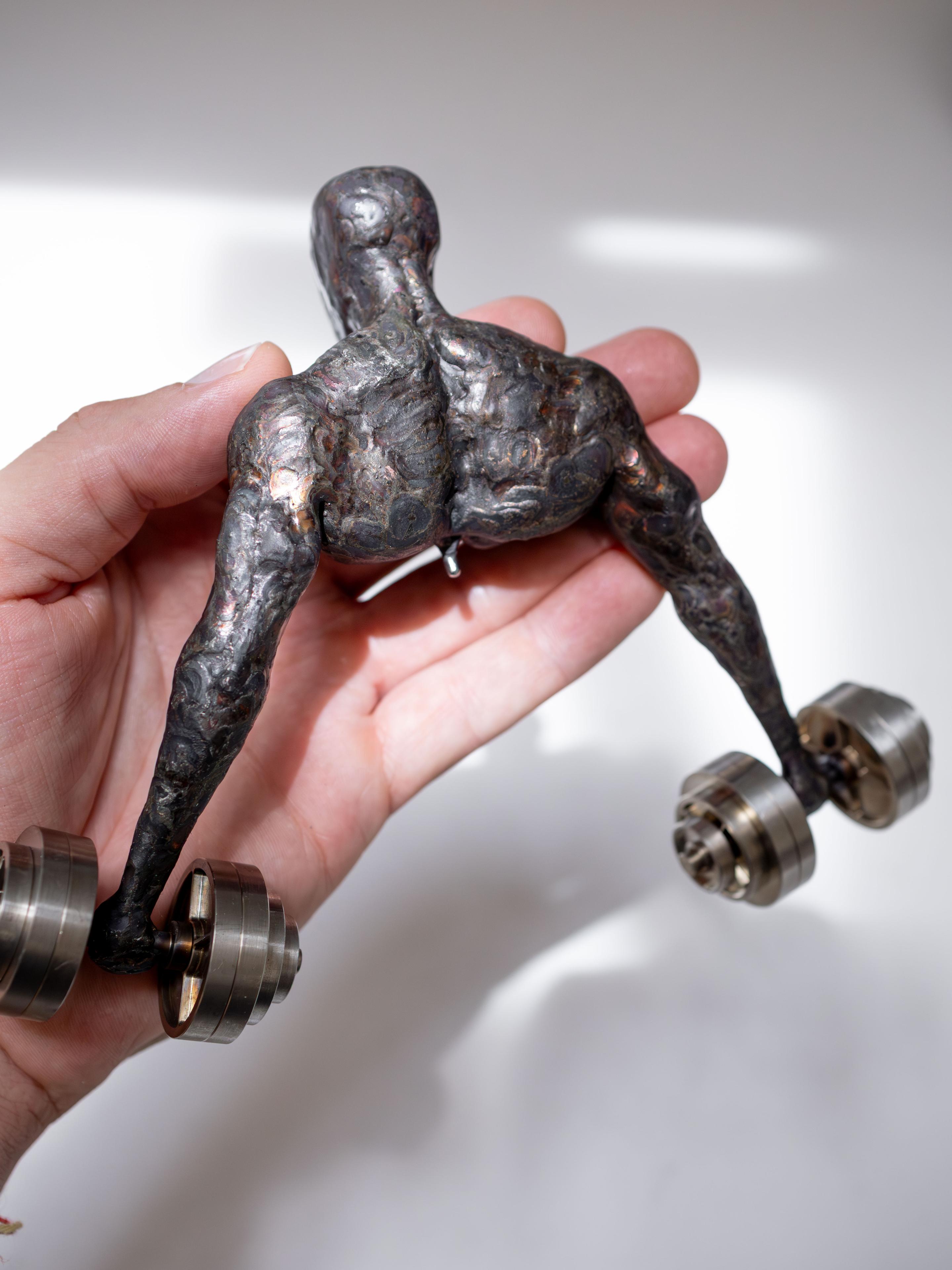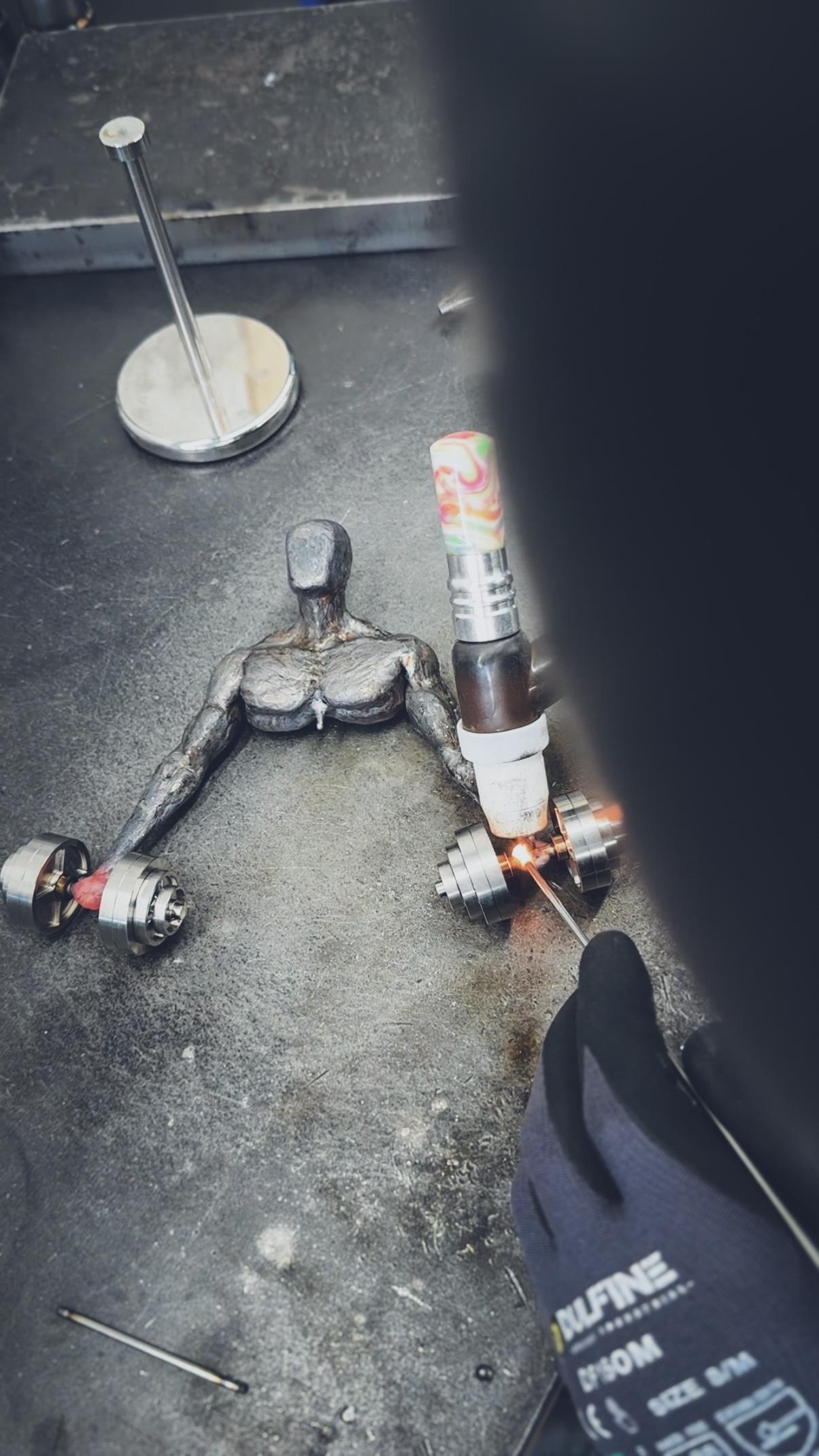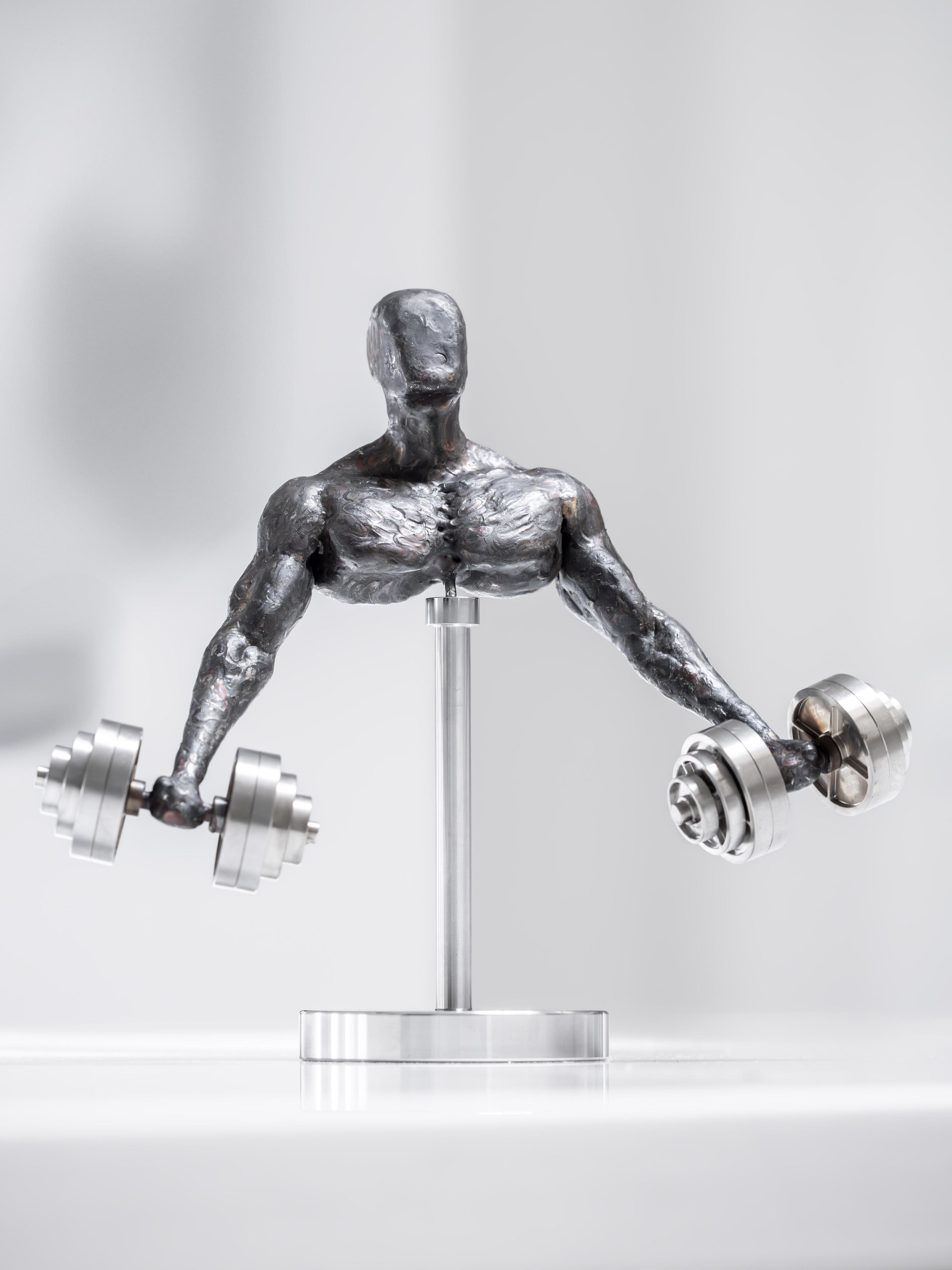 This sculpture was built starting with nothing but bare stainless steel barstock. Using my TIG welder, I slowly added weld on top of weld and placing metal where muscle and flesh should be. Sculpting this figure out of steel was a challenge on its own. The dumbbells he holds in his hands are cnc machined from stainless steel. The plates were also designed and specked-out by myself. I stack the weights on the dumbbell to achieve proper balance taking into account proper aesthetics of the dumbbells as well. The weights even spin as they are naturally connected to the bar like a real dumbbell. There is only one small tack-weld holding the end plate and the rest in place.