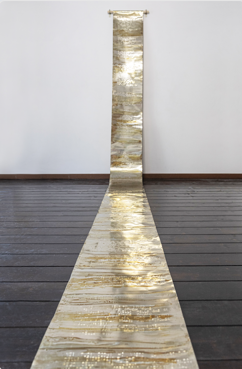 Thanks mother for this ancient cry, without it I would be just a dry and still body. The work starts with these words, which are written on the very first part of the aluminium scroll. With days, months, years, thoughts becomes thicker and the keep on growing on the scroll. With time the sculpture grows and words become a solid body, revealing their tridimensional nature that has a specific weight. This work is a stream that gives a tridimensional shape to words. This happens on a scroll that has been treated with fat matter in order to have a stratificated pattern that has something to do with Robert Smithson work "Strata: a geophotographic fiction".