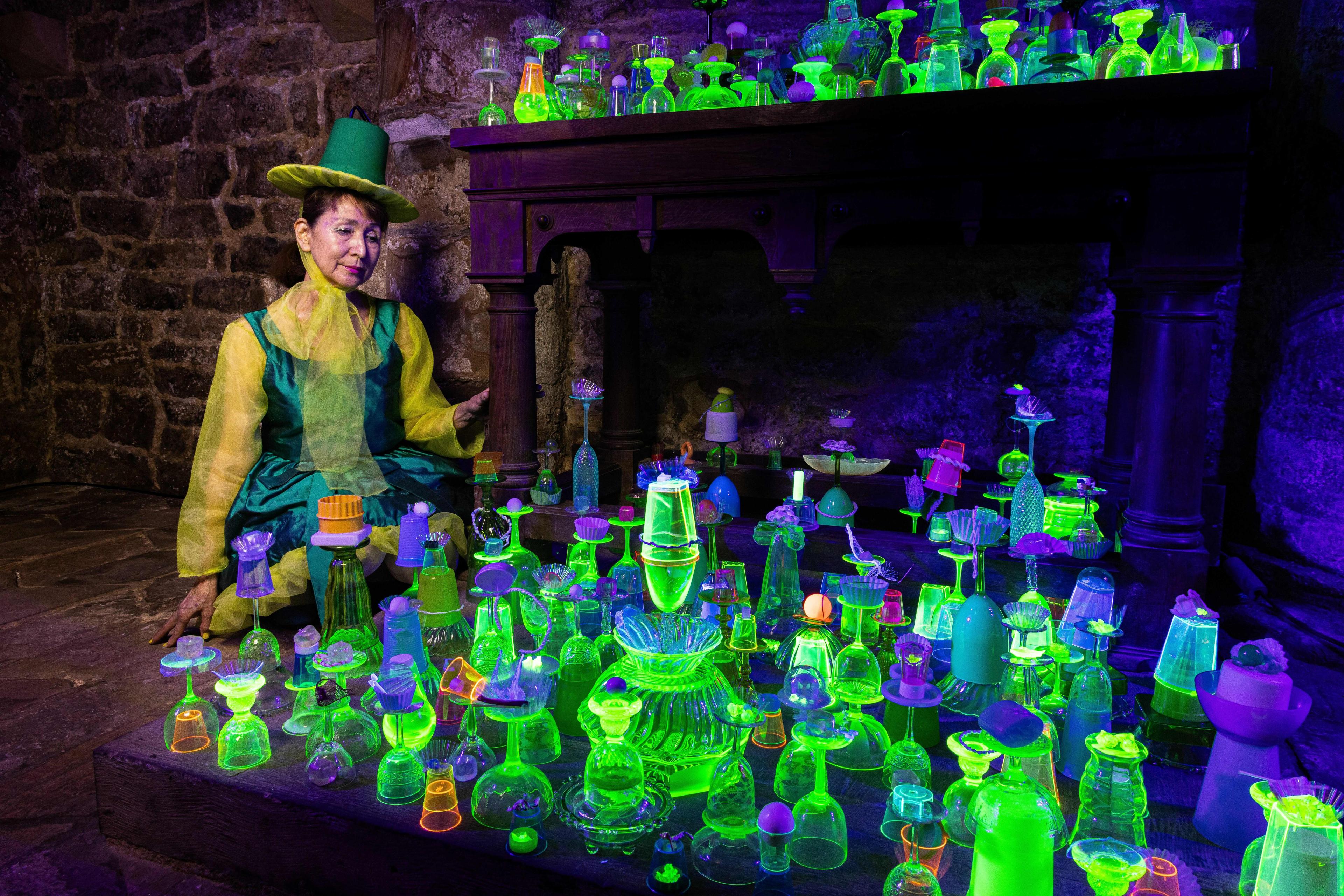 This body of work, REMAIN explores transformation and the fluid boundaries between human and non-human forms, as well as between human and planetary timescales. Central to Miria Miria’s practice is the use of discarded plastics—materials shaped by human consumption yet often overlooked or abandoned. In this series, she integrates uranium glass, adding another dimension to her installations. The works reveal two distinct appearances: by day, their playful, colourful forms shine under the light; by night, under blacklight, they transform, glowing with an otherworldly presence.