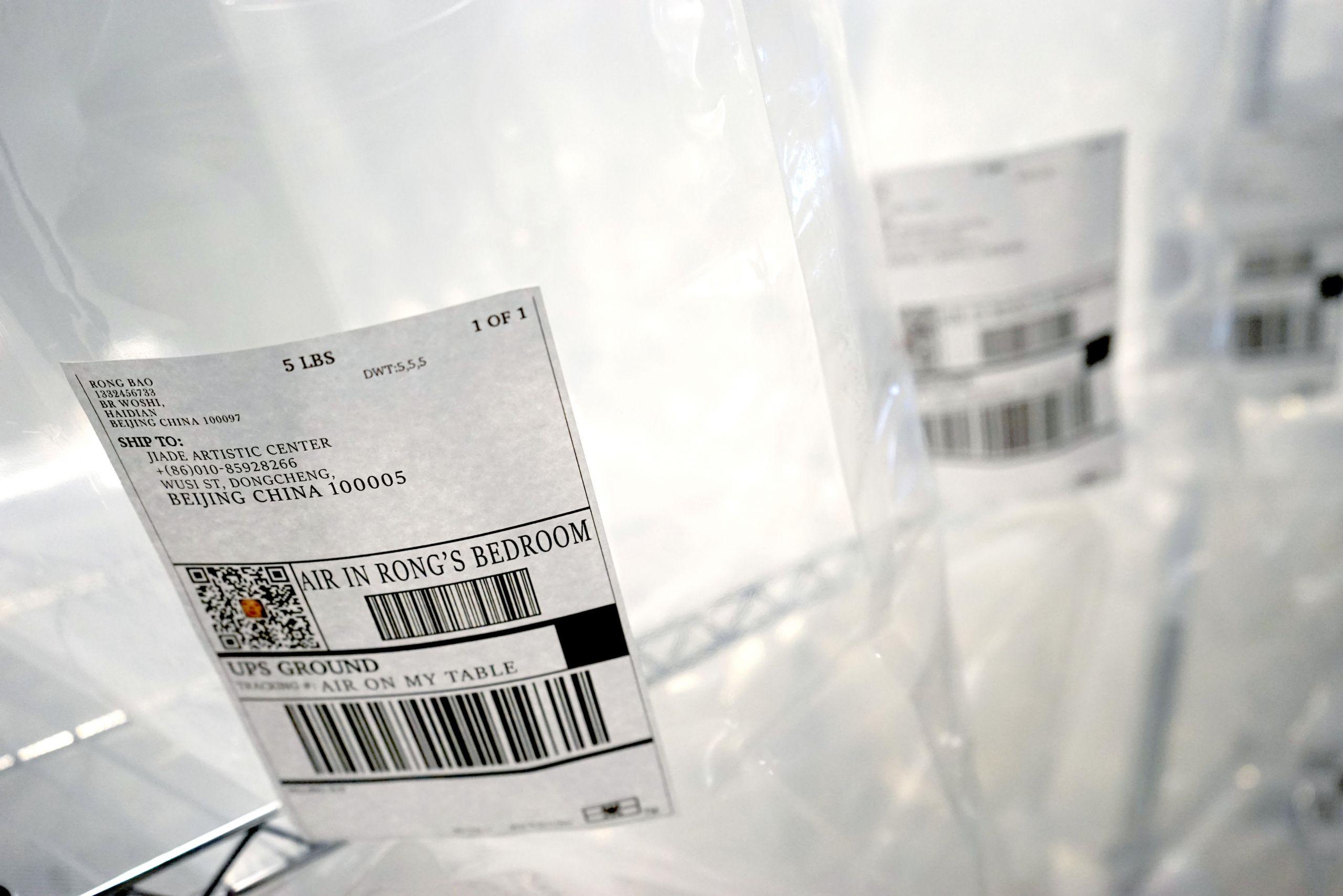 To materialize the air in my own bedroom by means of inversing functionalization, I want to deal with the relationship between the intimate space and the public. Through packaging, transportation, and storage, the intimate personal space becomes public. In the current society, everything can be a commodity, can be labeled, can be transported, and can be stored. Express delivery is used to turn an art project into an item that is being transported. This concept only exists on the way. This concept will disappear before departure or after landing. The identity of the item during transportation will be blurred.