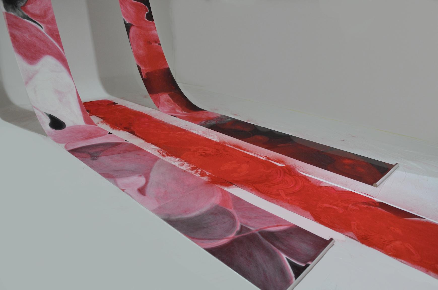 The complete image of the initial state, the video documentation of my performative intervention, and the traces left by the peeling color powder together form a trinity of narratives. As the scattered color traces fall to the ground, the audience becomes a “secondary deconstructor” through their participation, echoing the uncontrollable nature of desire and the fluidity of memory.