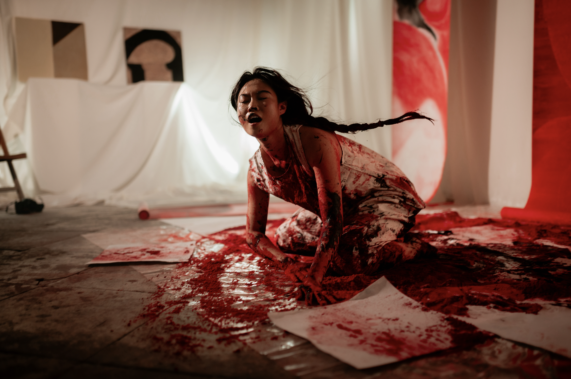 The Joy of Fish and Water is a monumental rice paper work where I integrate performance art with traditional ink painting, using the flux and dissolution of desire as a thread to explore the transient nature of emotional relationships. I construct a dialogue between the “arc aesthetics” of Eastern painting and the “scientific perspective” of the Western Renaissance, while deliberately disrupting pictorial integrity through the physical intervention of color powder—an allegory for the fragility of memory and desire.